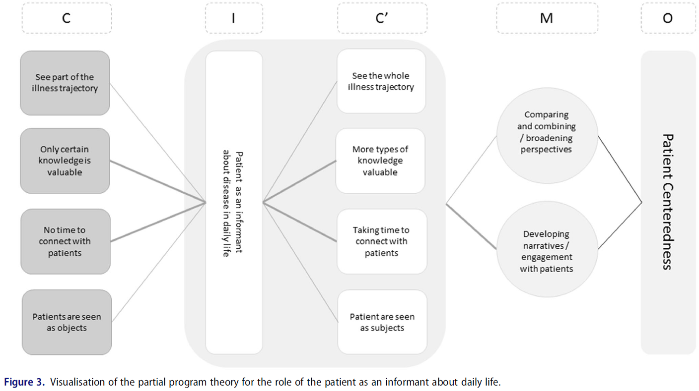 We identified mechanisms expected to be activated when people participate in these interventions and hence increase the chance for a successful outcome, being patient-centredness. These mechanisms existed on a personal level and can be described as the reasoning and responses of individual participants that result from the changed context (Astbury and Leeuw 2010). Through discussions among the researchers, we made sure that mechanisms identified were not intervention components and as such would have been ‘designed’ or ‘implemented’, but rather concerned the processes that cause the outcomes. An illustration of the complexity of these considerations can be seen in the description of the mechanism labelled ‘reflection’; we had to be very clear that reflection as an ‘assignment’ was not what the researchers inferred from the data (see Supplementary Appendix 4).