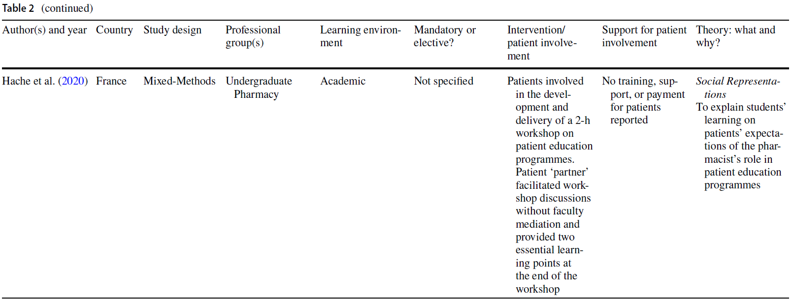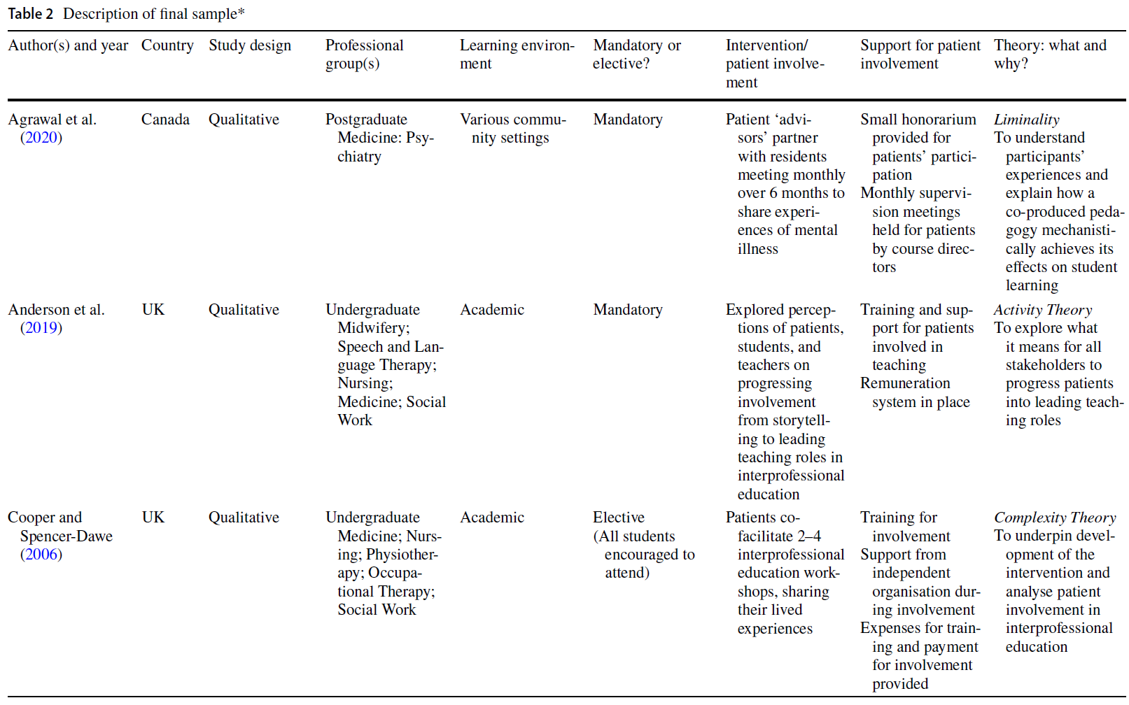 The final 7 high-quality theoretical papers were published between 2006 and 2020, most (n = 5) within the last two years and were from Europe and Canada (Table 2). Four papers focused on uni-professional student groups: two were undergraduate in medicine (Kline et al., 2020) and pharmacy (Hache et al., 2020), and two were postgraduate in medicine (Jha et al., 2015) and psychiatry (Agrawal et al., 2020). Two studies were interprofessional including medicine, speech and language therapy, midwifery, nursing, physiotherapy, occupational therapy, and social work (Anderson et al., 2019; Cooper & Spencer-Dawe, 2006). One paper focused on patients involved across a faculty of medicine and health sciences (Read et al., 2020). All but one paper (Hache et al., 2020) stated whether the teaching was mandatory (Agrawal et al., 2020; Anderson et al., 2019; Jha et al., 2015) or elective (Cooper & Spencer-Dawe, 2006; Kline et al., 2020). Patient involvement occurred in the classroom (Anderson et al., 2019; Cooper & Spencer-Dawe, 2006; Hache et al., 2020; Jha et al., 2015); with two in community settings (Agrawal et al., 2020; Kline et al., 2020). Four papers adopted a qualitative methodology (Agrawal et al., 2020; Anderson et al., 2019; Cooper & Spencer-Dawe, 2006; Kline et al., 2020), two papers a mixed-methods approach (Hache et al., 2020; Read et al., 2020), and one reported a randomised controlled trial (RCT; Jha et al., 2015). Although we were unable to definitively assign a level of involvement, most studies demonstrated concerted efforts to work towards this through consideration of patient payment, training, support, and involvement beyond curriculum delivery.