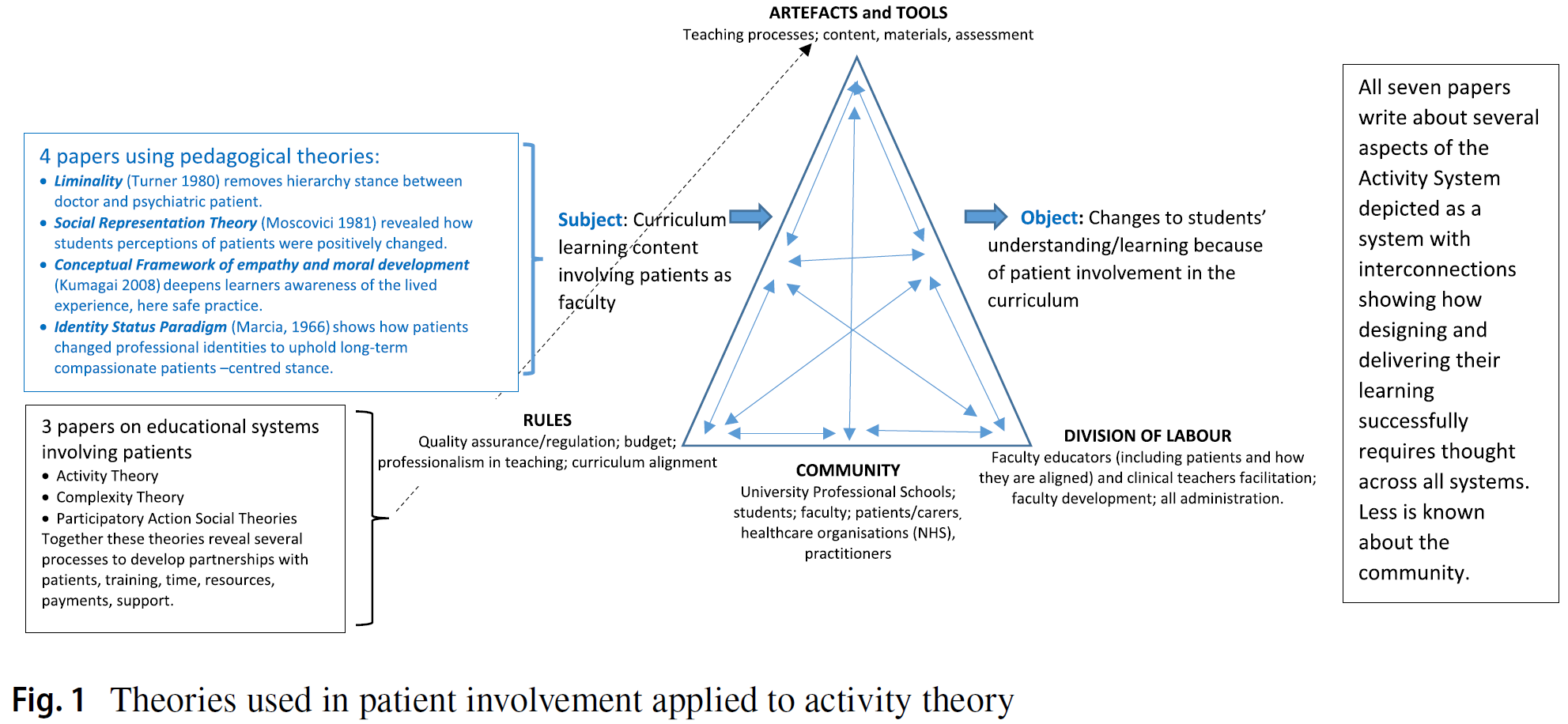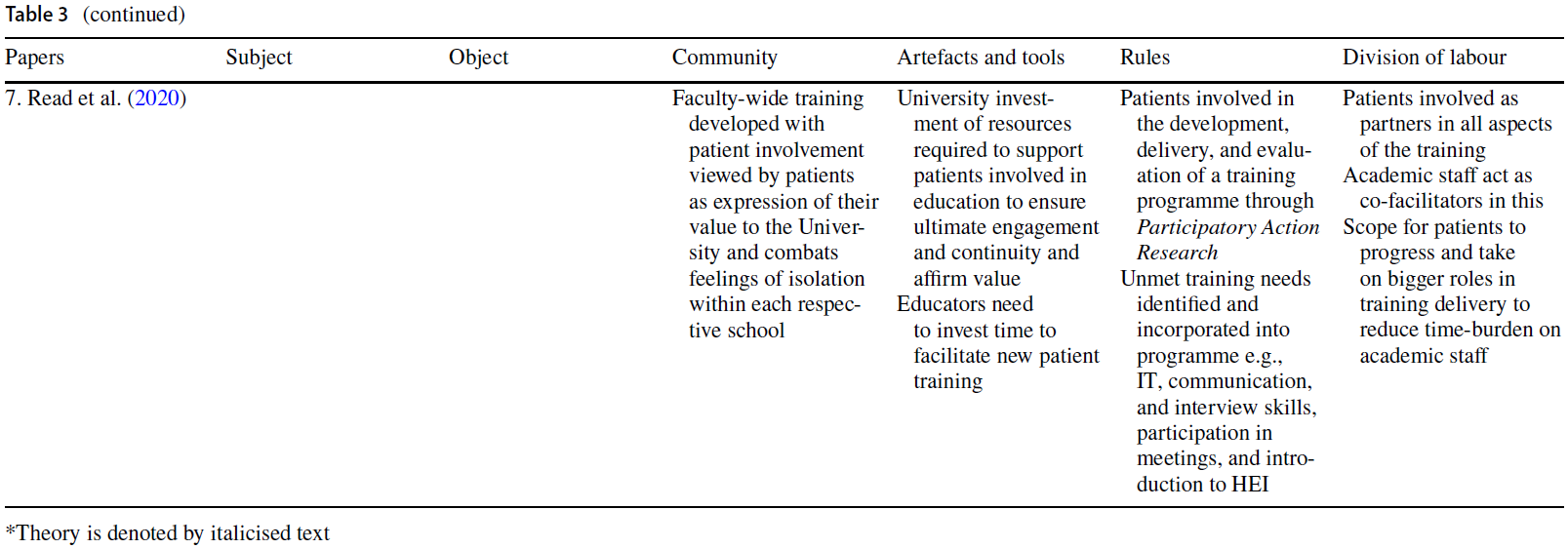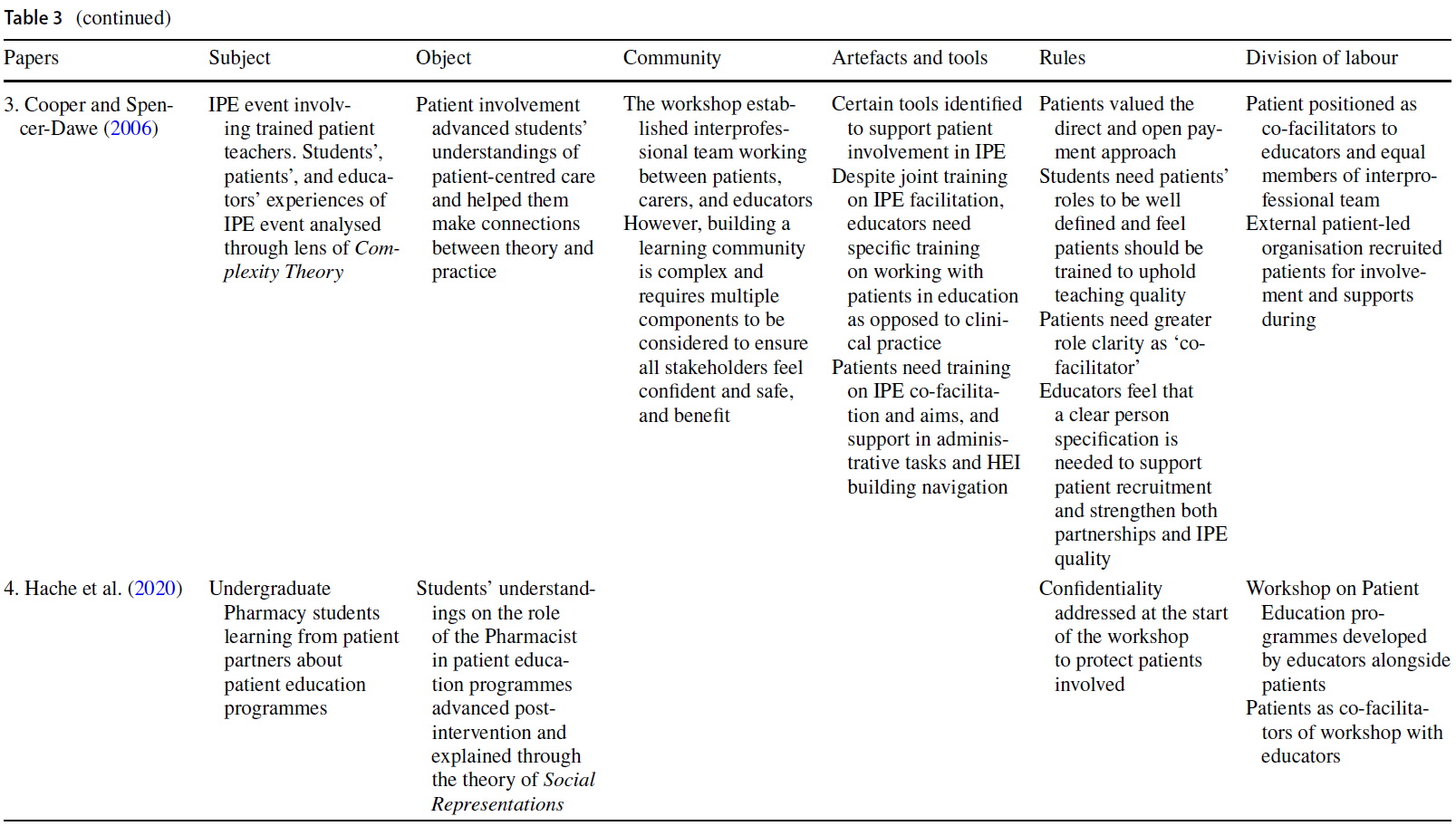 Our analysis using Activity Theory revealed that we know less about the HEI system as a whole (triangle of Rules, Tools and Artefacts, Division of Labour, and Community). We identified three papers which applied theory to patient involvement within the HEI system. Read et al. (2020) used PAR to demonstrate the benefits and challenges of extending partnership working beyond educational activities to the development of the processes needed to support involvement. Anderson et al. (2019) used Activity Theory (Engeström, 2001), and Cooper and Spencer-Dawe (2006) used Complexity Theory (Tosey, 2002) to highlight the complexity of patients leading teaching in IPE. These theoretically underpinned studies add a richness to our understanding of what it means to bring patients into a HEI system, both for faculty and for acceptance by students.