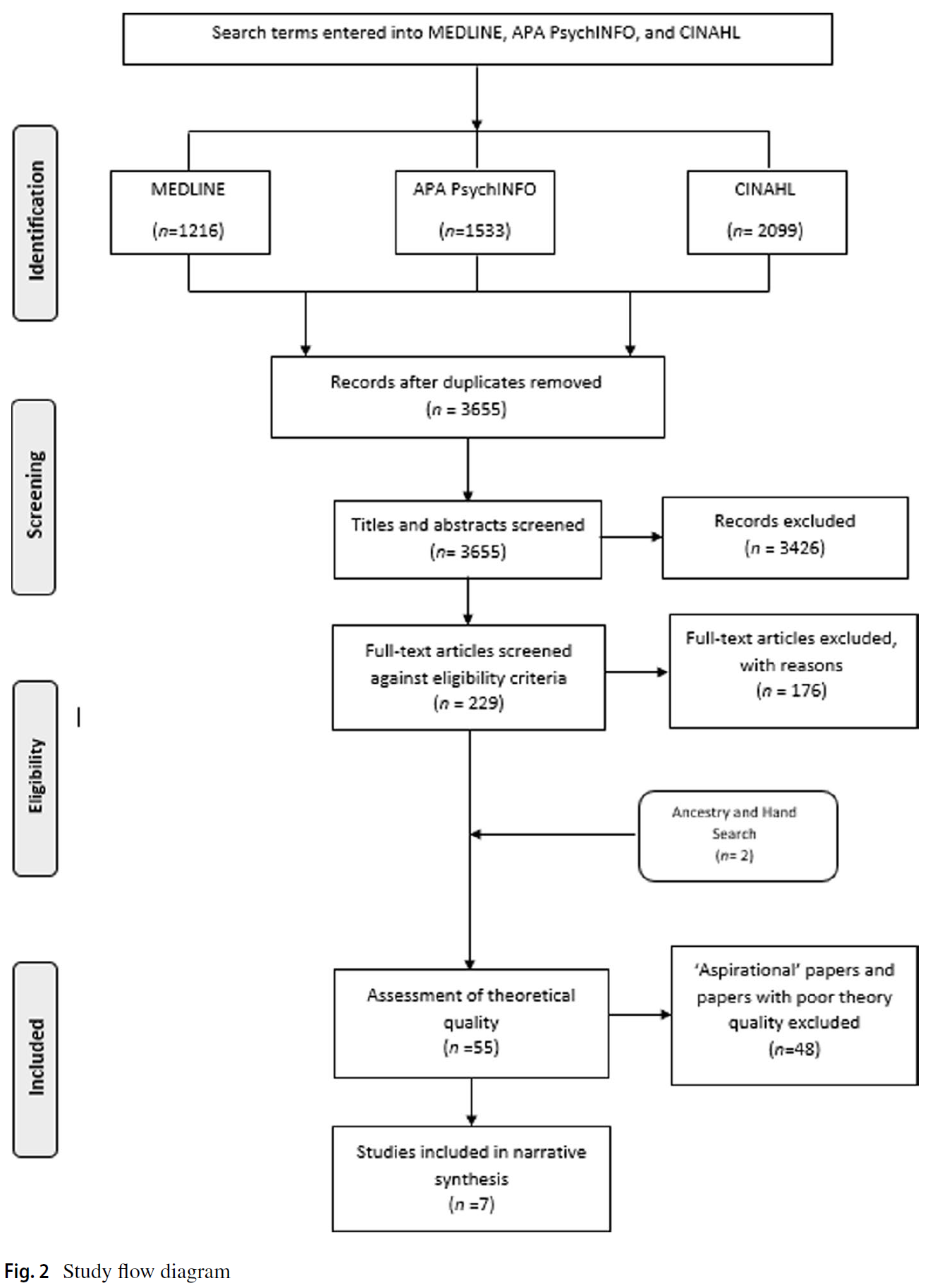 The final searches produced a total of 4848 citations. After removing duplicates, the resulting 3655 citations were available for title and abstract screening. 229 papers were retained and checked, in full, against the eligibility criteria, followed by an additional 2 papers retrieved through hand and ancestry searching. 55 papers met the eligibility criteria and were taken forward for the assessment of theoretical quality by all three authors. Only papers demonstrating theoretical sophistication were included. The degree of agreement on inclusion/exclusion between all authors (ABW, SG, EA) at this stage was approximately 91%. Conflicts between reviewers’ judgments on the remaining 9% of the papers assessed for theoretical quality were resolved through discussion. This left a final sample of 7 high-quality theoretically underpinned papers, all of which scored the maximum 9/9 points on the Theoretical Quality Tool (Hean et al., 2016). Figure 2 provides an overview of how the final sample was reached.