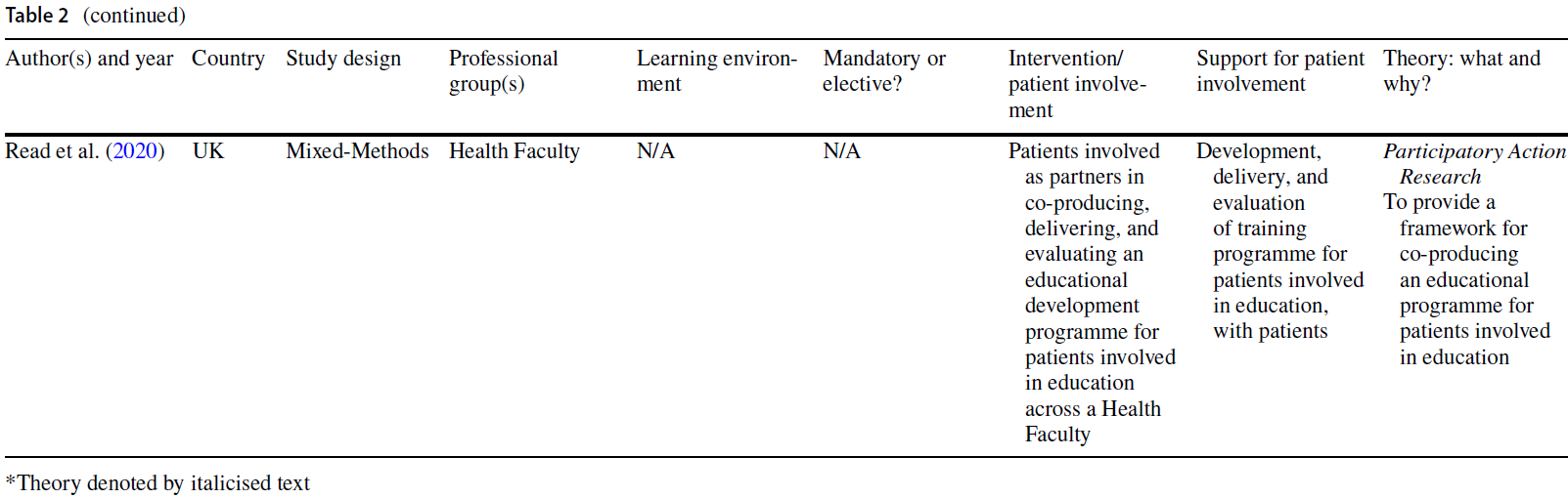 Recent reviews (De Groot et al., 2020; Dijk et al., 2020; Gordon et al., 2020) have not looked beyond medical education, possibly missing learning from other professions and interprofessional education (IPE). More importantly, these reviews have not taken a systematic approach to searching for and synthesising theory, nor have they used a dedicated theoretical quality appraisal tool to assess the quality with which theory has been applied in each study. Theoretical reviews, which seek to explore the effective use of theory, address these issues and are an important resource to support health and social care educators (Hean et al., 2018). The use of a tool to assess theoretical quality (Hean et al., 2016) ensures theory has been applied and aligned throughout a study to reveal deeper understandings. There has not yet been a theoretical review of the literature on patient involvement in any area of professional health and social care education, despite increasing calls for theoretical perspectives (Regan de Bere & Nunn, 2016).