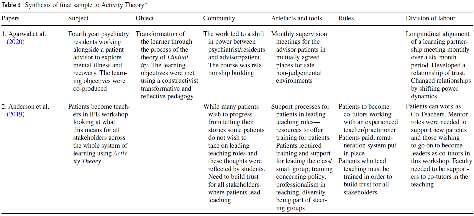 - the three papers that explore the integration of patients into the educational community highlight the complexity issues within the triangle of Rules, Artefacts and Tools, Community and Division of Labour (Anderson et al., 2019; Cooper & Spencer-Dawe, 2006; Read et al., 2020).