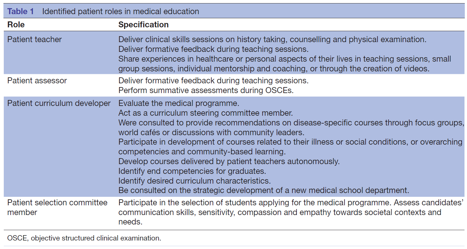 Discussion: This systematic review provides new knowledge and practical insights to physicians and faculty on how to incorporate active patient involvement in their institutions and daily practice, and provides suggested action points to patient organisations wishing to engage in medical education.