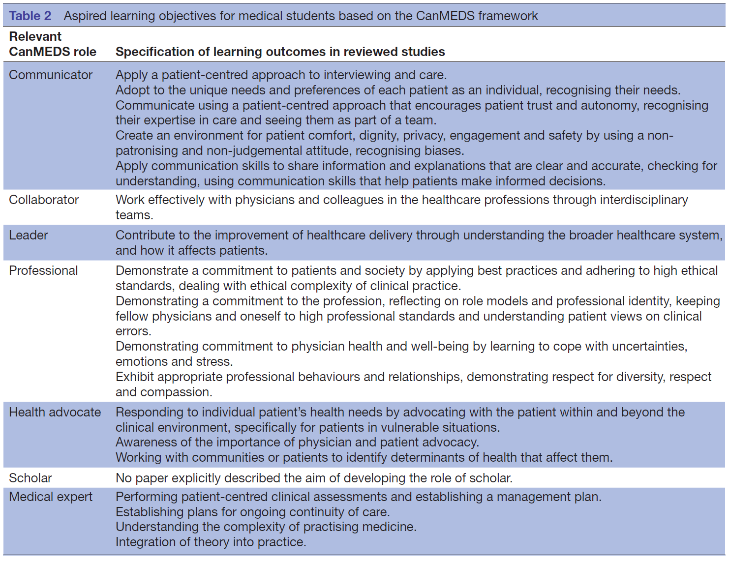 이 검토에서 확인된 학습 목표는 미래의 의사를 위한 CanMEDS의 역할 중 한 가지를 제외하고 모두 포함되었습니다. 이는 환자의 참여가 의료 커리큘럼의 다양한 측면에 지속적으로 더 큰 영향을 미치고 있음을 보여줍니다.
