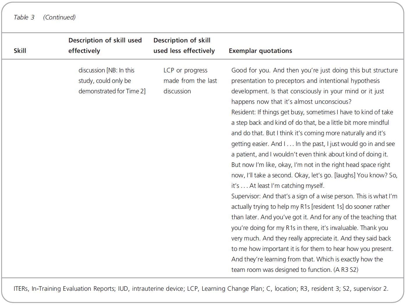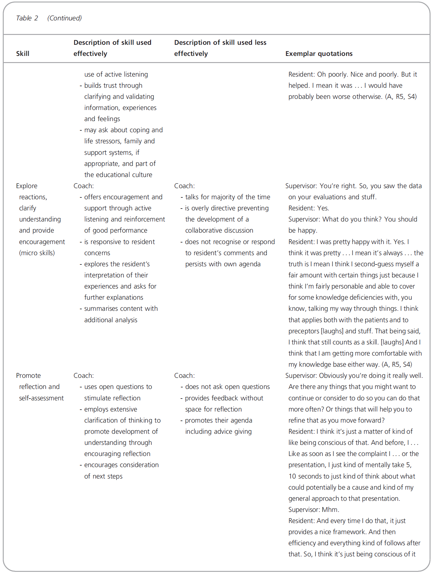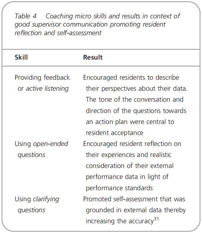 This study adds to that earlier work by identifying and describing the specific coaching skills required to achieve these outcomes, and how the skills are used. However, incorporating these skills into existing approaches also creates challenges for programmes, supervisors and residents.