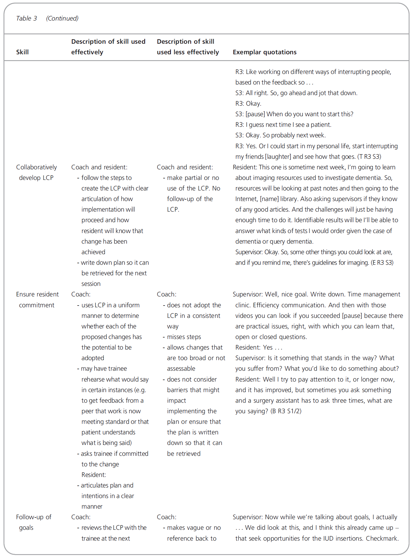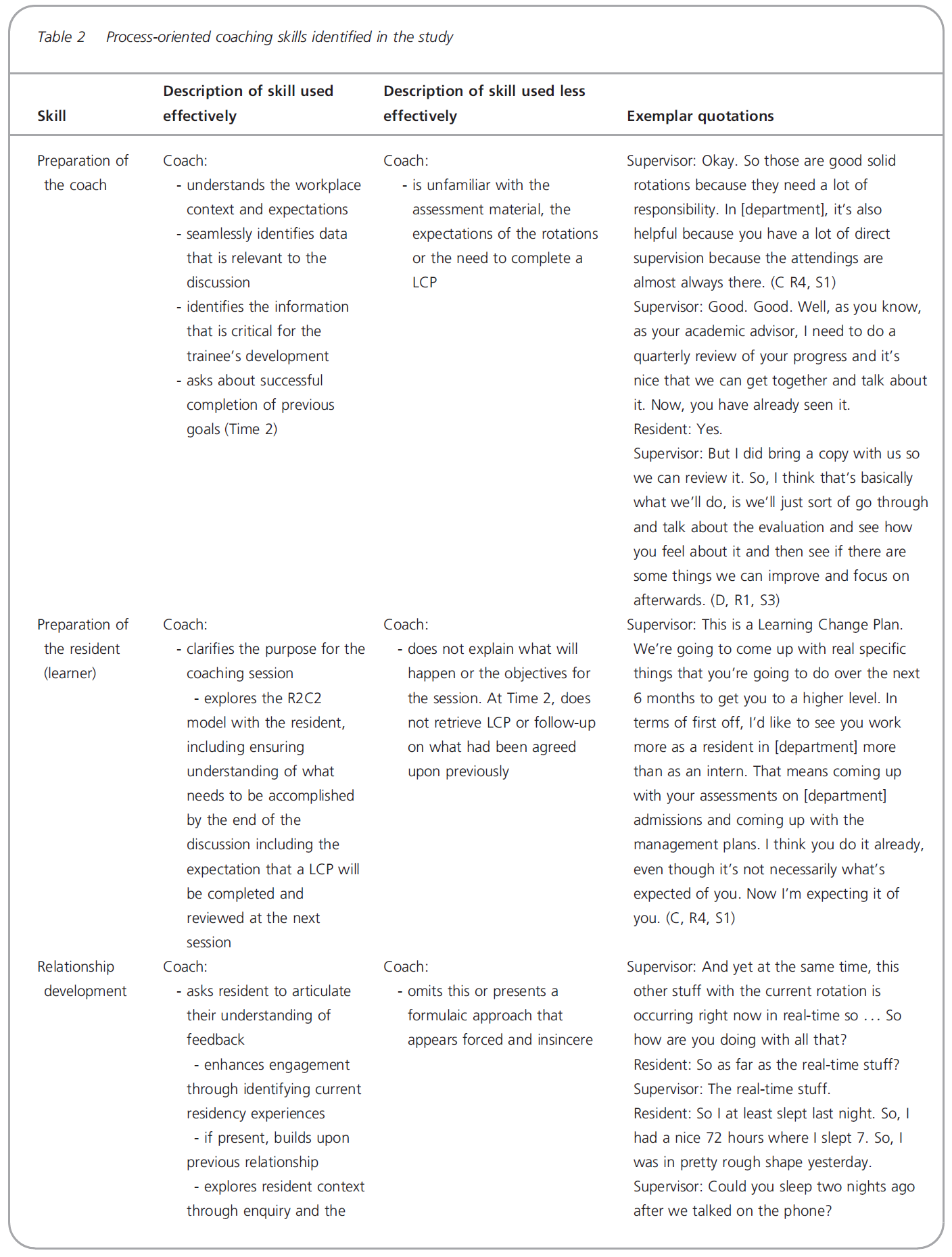 In summary, we learned from this study that coaching requires using specific process- and content-oriented skills identified in the literature, and that supervisors in residency education can apply these skills in feedback and coaching sessions with residents. Using them effectively