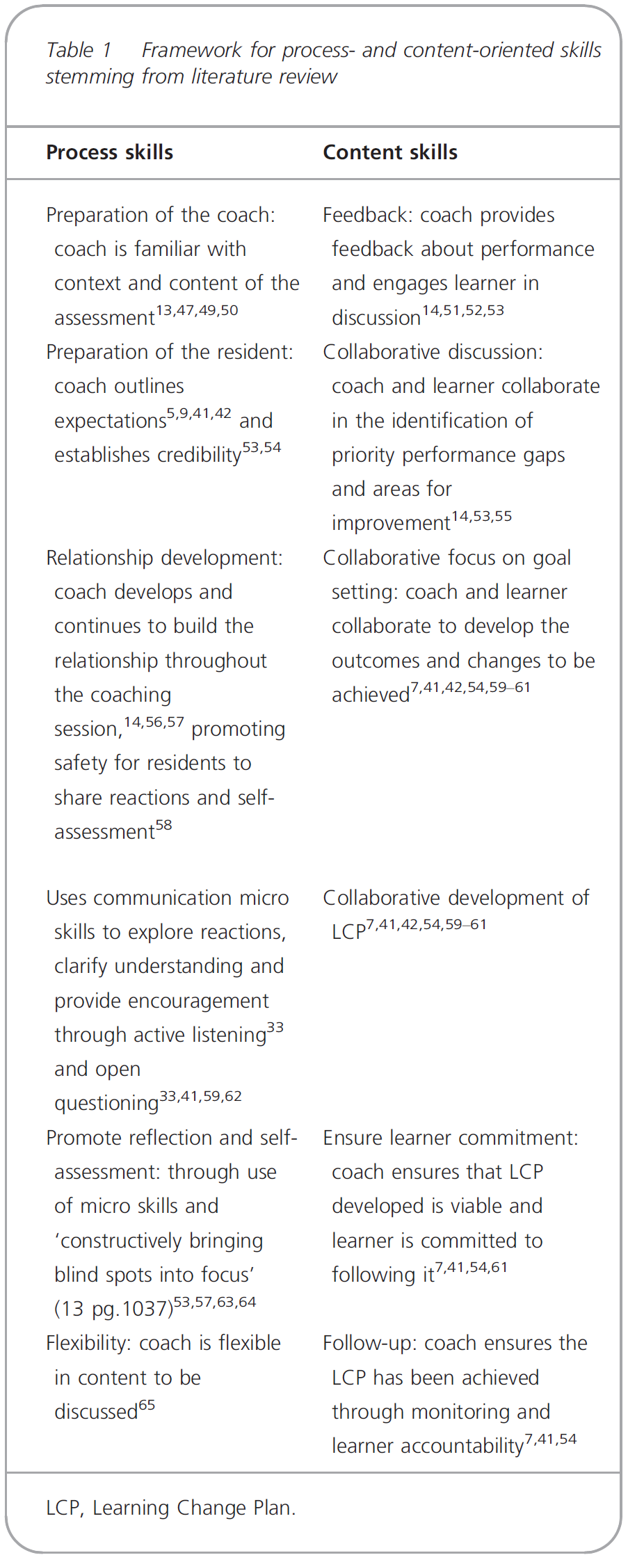 Its development was founded upon three bodies of theory and research, which provide the guidance and sensitising concepts for R2C2 use and its evaluation. These include humanism and learner-centredness, informed self-assessment, and the science of behaviour change.3 Results of the study in residency education24 showed the model was effective in engaging residents in a reflective, goal-oriented discussion about performance data, supporting coaching and enabling collaborative development of a change plan. However, at that time, we did not perform an in-depth analysis for the specific skills of coaching, as identified in the literature and highlighted in Table 1.