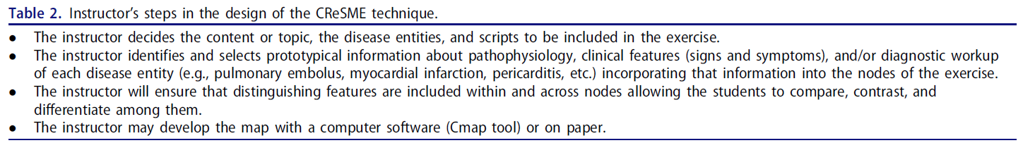 - The CReSME provides visual representation/scaffolding of emerging illness scripts, which might support knowledge encapsulation and organization allows students to work directly on their scripts relevant to a given chief complaint.
