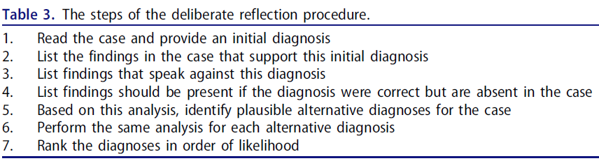 Depending on the format of DR (see below), the clinical cases should be presented together with cues on the alternative diagnoses to be considered during reflection or not.