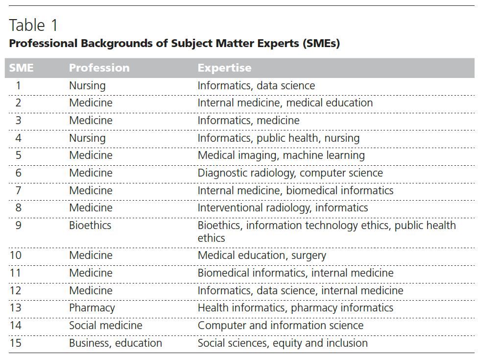 We identified SMEs in the use of AI-based tools in health care settings through literature review, professional contacts, and snowball techniques (asking participants to recommend other SMEs) and invited them to participate in this study. 19 To be eligible for the study, individuals needed to work in U.S. health professions education or health informatics. This purposive sampling process ensured representation from multiple professions and included those with special expertise in ethics and equity. The SMEs received an honorarium for their participation in the study.