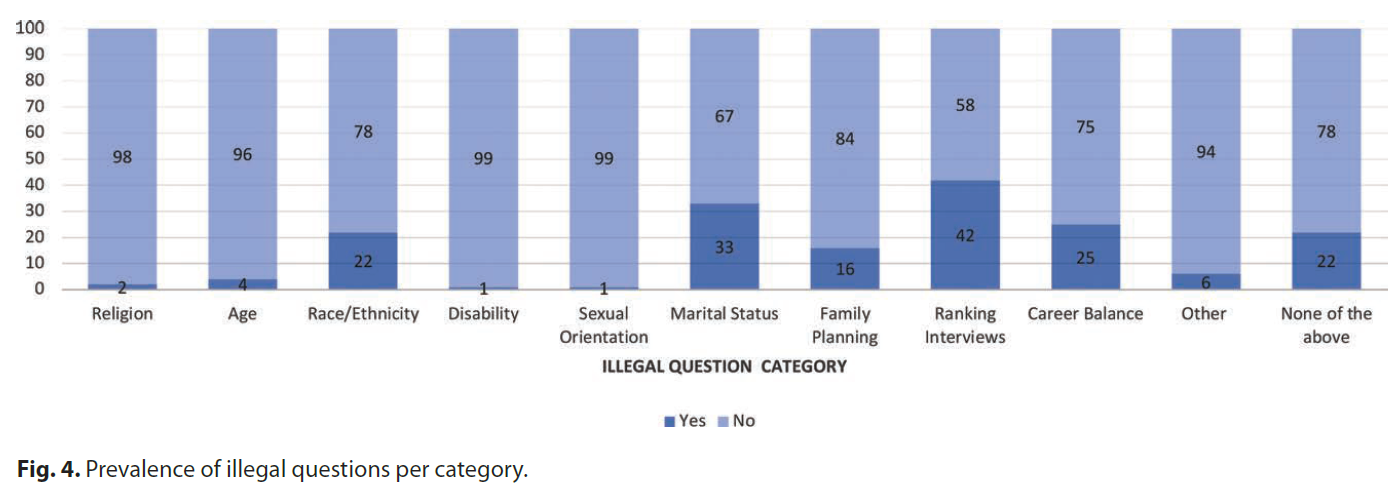 - In contrast, Hern et al revealed that 53.3% of respondents reported illegal questions on marital status, 24% regarding children, and 13.8% being asked about plans for child rearing in a survey sent to 11,000 applicants of both surgical and nonsurgical specialties.9,11