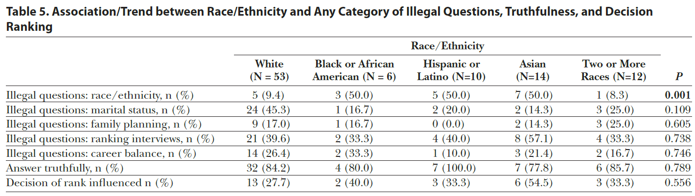 반면, 결혼 여부 또는 출산/가족 계획에 관한 질문은 종종 주법에 의해, 더 나아가 연방법에 의해 금지되어 있습니다.14 이러한 유형의 질문에 대한 본 연구 결과는 일반적으로 다른 전문 분야에서 발표된 연구 결과와 일치했습니다.9-13,22 그러나 이러한 질문이 여성 지원자에게 더 자주 묻는 것으로 나타난 선행 연구와 달리,9,10 본 연구에서는 성별 차이가 드러나지 않았습니다.