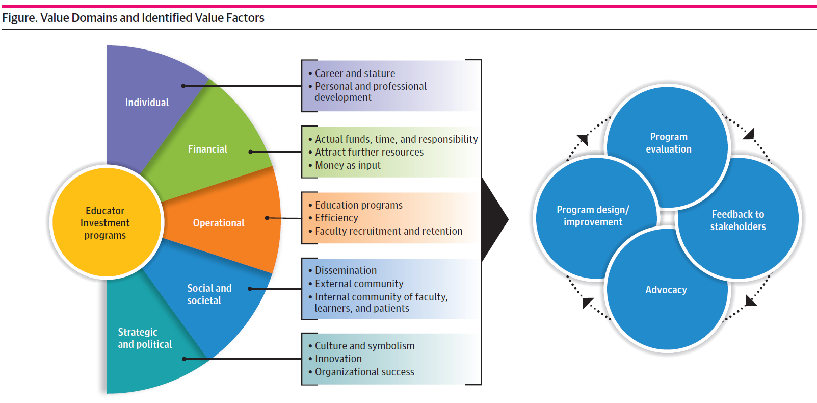 These findings suggest that health sciences and health system leaders found value in funding educator investment programs in multiple domains (individual, financial, operational, social or societal, and strategic or political) beyond direct financial return on investment. They perceived that tangible resources to support the growth and professional development of individual educators generate potent benefits to the organization and community. These values can inform program design and evaluation, effective feedback to leaders, and advocacy for future investments in the context of competing priorities in academic medicine. This approach can be used by other institutions to identify context and leader-specific value factors from their leaders.