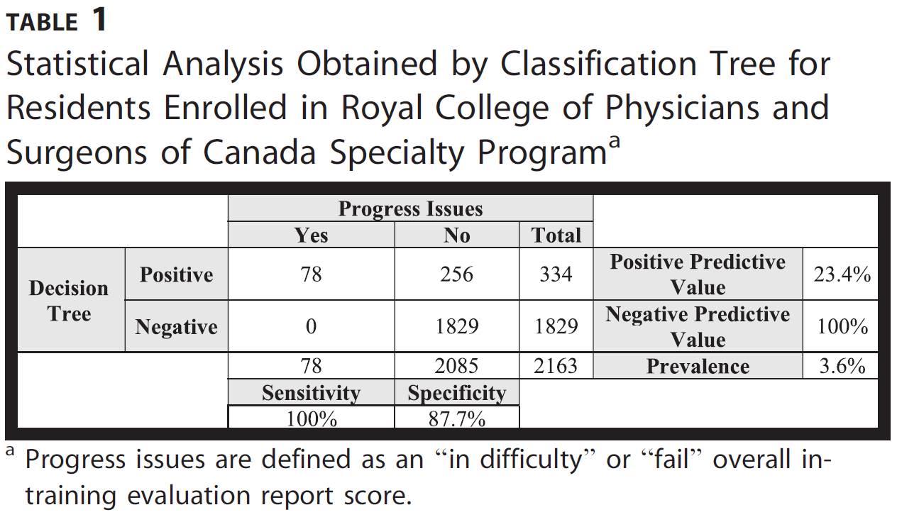 표 1은 RCPSC 레지던트 프로그램에 등록한 레지던트를 분류할 때 선택한 규칙의 성능을 보여줍니다. 이 분류 규칙은 100%의 민감도를 달성하는 동시에 87.7%의 특이도를 최대화합니다. 이 특정 그룹에서는 2163명의 레지던트 중 78명(4%)에서 진행 문제가 확인되었습니다. 분류 트리는 이러한 전공의를 진행 문제가 있는 것으로 정확하게 분류했습니다. 그러나 분류 트리는 난이도 또는 실패를 나타내는 전체 점수는 없었지만, 256명의 전공의를 진행 문제가 있는 것으로 식별하여 23.4%의 양의 예측값을 얻었습니다.