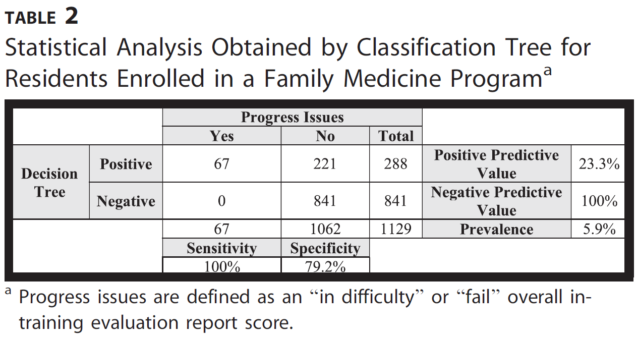 표 2는 가정의학과 프로그램에 등록한 레지던트를 분류할 때 선택한 분류 규칙의 성능을 보여줍니다. 이 분류 규칙은 민감도 100%를 달성하는 동시에 특이도는 79.2%로 최대화했습니다. 이 그룹에서는 1129명의 레지던트 중 67명(6%)에서 진행 문제가 확인되었습니다. 분류 규칙은 이러한 레지던트를 정확하게 식별했지만, 난이도 또는 실패를 나타내는 전체 점수는 없었지만 221명의 레지던트를 진행 문제가 있는 것으로 식별하여 23.3%의 양의 예측값을 얻었습니다.