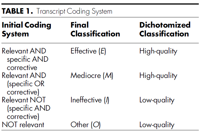 Coders classified the feedback following the methods described by Ahle et al15, with an initial classification of the transcripts as “relevant” or not. If a transcript was coded as “relevant”, subsequent coding would assign the transcript as being “specific”, “corrective”, both, or neither. These binary attributes were assessed by each trained rater. Coding for each transcript occurred at the sentence level; if any sentence within a transcript qualified as “relevant”, “specific”, and/or “corrective”, the entire transcript would be coded as such.