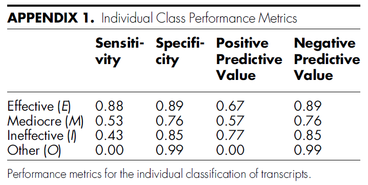 Results: The model classified the quality (high vs. low) of 2,416 narrative feedback transcripts with an accuracy of 0.83 (95% confidence interval: 0.80, 0.86), sensitivity of 0.37 (0.33, 0.45), specificity of 0.97 (0.96, 0.98), and an area under the receiver operating characteristic curve of 0.86 (0.83, 0.87).