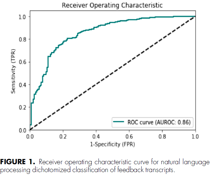 Design: Narrative surgical resident feedback transcripts were collected from a large academic institution and classified for quality by trained coders. 75% of classified transcripts were used to train a logistic regression NLP model and 25% were used for testing the model. The NLP model was trained by uploading classified transcripts and tested using unclassified transcripts. The model then classified those transcripts into dichotomized high- and low- quality ratings. Model performance was primarily assessed in terms of accuracy and secondary performance measures including sensitivity, specificity, and area under the receiver operating characteristic curve (AUROC).