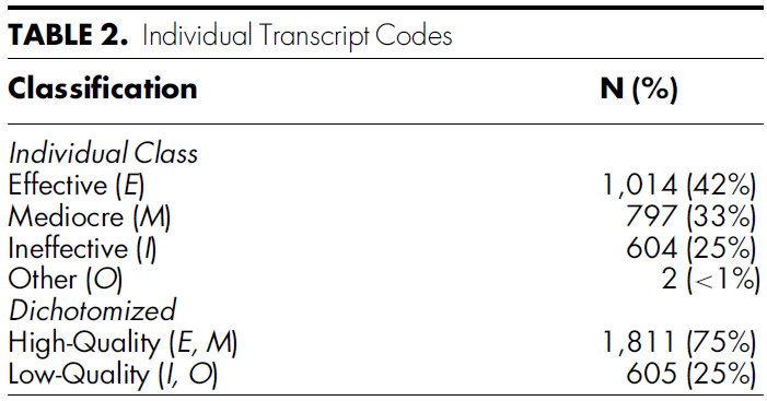 A total of 2,416 transcripts were coded for quality and are described in Table 2. Overall, 1,014 (42%) were coded as Effective (E) and 1,811 (75%) of the transcripts were high quality (E, M). Examples of high quality and low-quality feedback are shown in Table 3.
