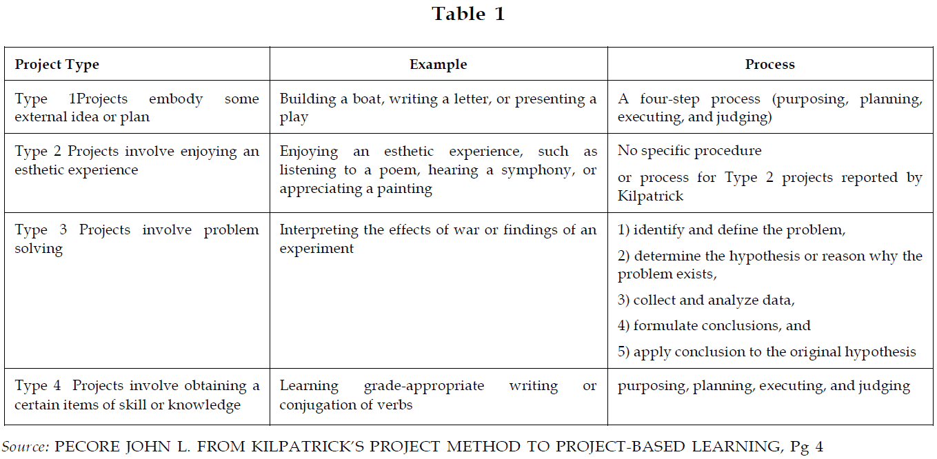 Kilpatrick (1918) offered a broad conception of project method. He identified four types of projects with procedures listed in Table 1: