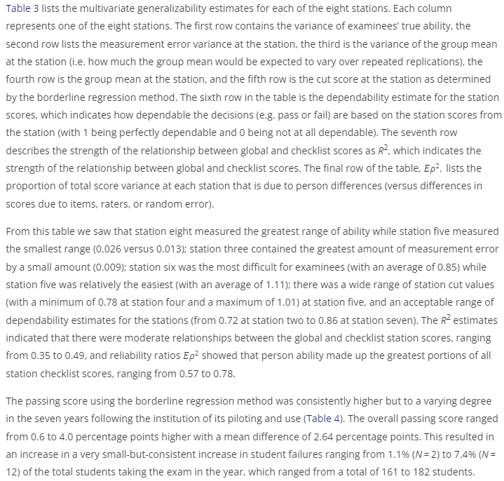 저희는 Homer와 Pell(2009)의 제안(보충 부록 2, A4)에 따라 OSCE 점수의 품질과 경계선 회귀 결과를 평가했으며, 글로벌 점수와 스테이션 점수에 대해 각각 무작위 효과 분산분석(random-effects ANOVA)을 실시했습니다. 이를 통해 스테이션/평가자 점수가 전반적으로 얼마나 다른지, 스테이션에서 개인별 점수가 얼마나 다른지, 학습자 능력과 사례/평가자에 의해 설명되지 않는 분산의 비율(글로벌 평가 일관성 포함)을 설명했습니다(보충 부록 2, A5).