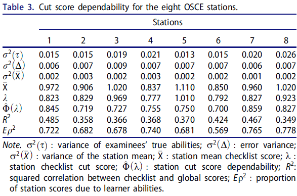We evaluated the quality of OSCE scores and borderline regression results based on suggestions from Homer and Pell (2009) (Supplementary Appendix 2, A4) and we conducted random-effects ANOVAs for the global scores and station scores, separately. This explained the degree that station/rater scores differed overall, how much person scores at stations differed, and the proportion of variance unexplained by learner ability and cases/raters, including global rating consistency (Supplementary Appendix 2, A5).