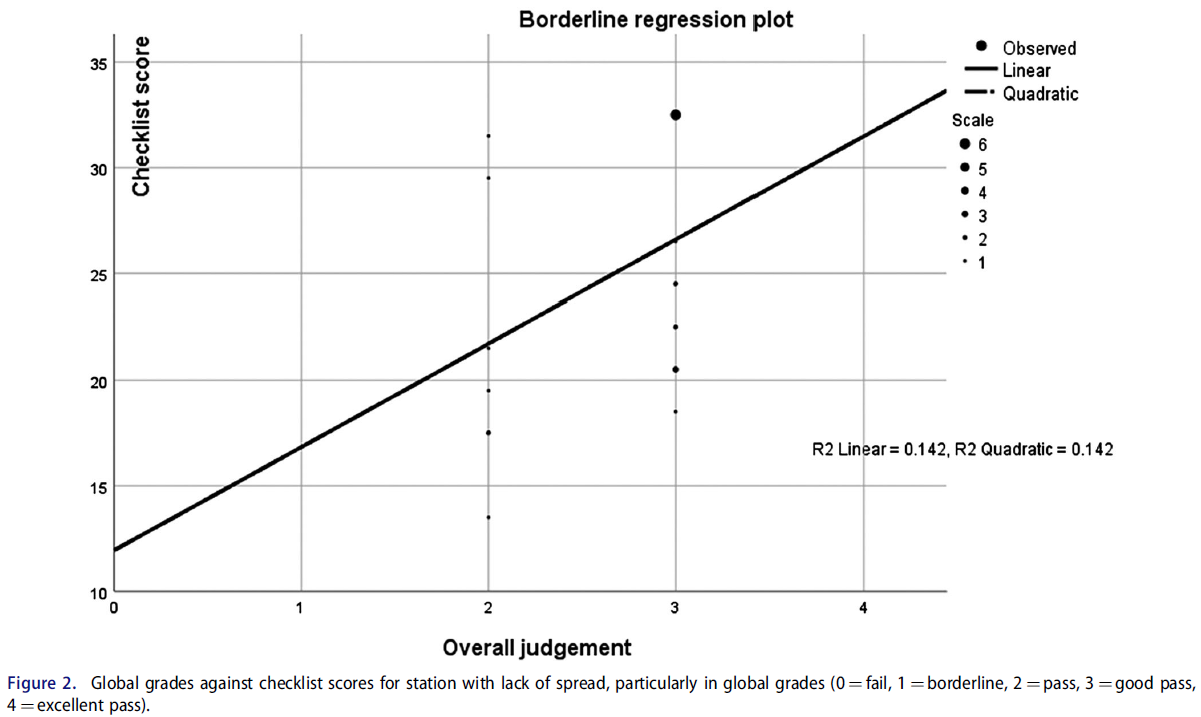 The analysis summarized in Table 1 suggests that BRM provides a feasible, and defensible approach to standard setting in these exams for a large percentage of stations (86%). A good example of where borderline regression is not doing so is shown in Figure 2, a knee examination station (Year 5, 2018, 22 candidates). The problem here is lack of spread in the global grades (only two of five possible grades employed), which leads to a low R-squared (=0.14) and subsequently to concern about the accuracy of the BRM pass mark for this administration.