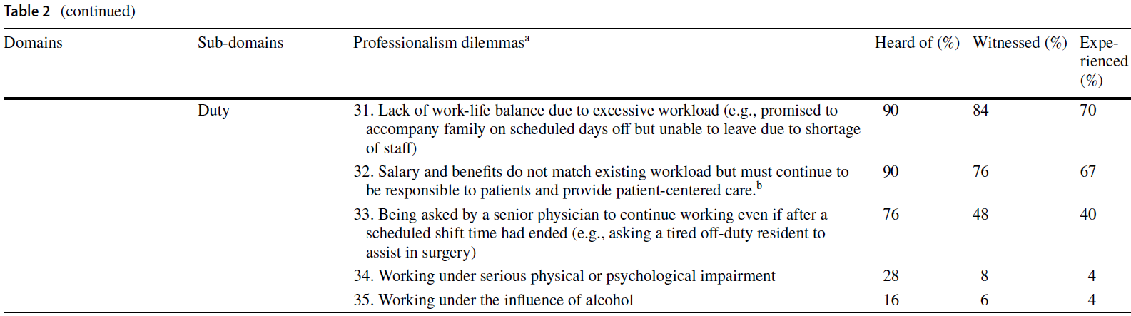 Evidence also showed that professionalism dilemmas negatively impact the development of professional attitudes, behaviors, and professional identity formation (Kushner & Thomasma, 2001). Today’s residents will be the ones who train residents in the future. If professionalism dilemmas are not appropriately addressed in a timely manner, a number of serious consequences may emerge for both physicians (e.g., compassion fatigue and burnout) and the whole of healthcare (e.g., decreasing the quality of patient care, even threatening patient safety) (Monrouxe et al., 2015).