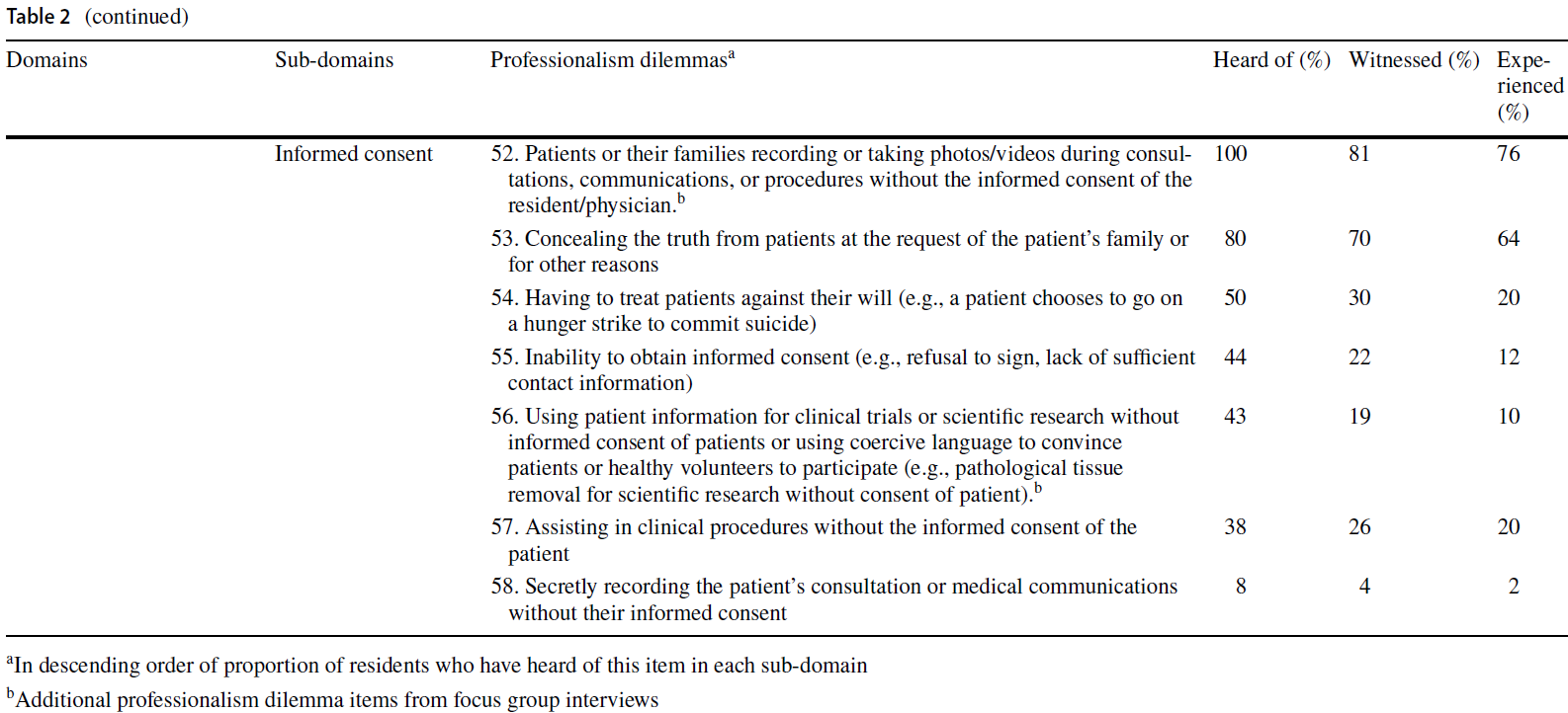 A comprehensive list of professionalism dilemmas would provide many benefits for both hospital administration as well as medical educators. For example, hospitals can use this as a checklist to assess existing professionalism challenges and to create targeted remediation for their residents (Cullen et al., 2017); on the institutional side, hospital administrators can also use this comprehensive list to assess whether institutional changes can be implemented. Clinical faculty and residency program directors can design teaching cases based on single or multiple dilemmas from this checklist and can also use this checklist to screen residents who may be deeply troubled by these professionalism dilemmas and implement remediation, guided by the specific, observable behavior-related challenges presented in the checklist (Cullen et al., 2017; Hawkins et al., 2009). Therefore, our research aims to develop a checklist of professionalism dilemmas based on a behavior-based professionalism framework, to examine the range and proportion of professionalism dilemmas heard of, witnessed, or experienced by Chinese residents, and to gain understanding of residents’ perspectives when faced with professionalism dilemmas.
