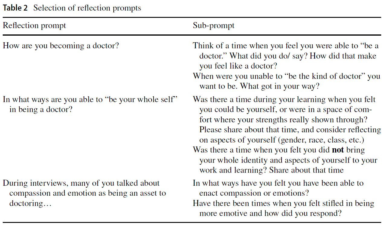 Data collection proceeded first with semi-structured interviews, designed using the narrative tradition (Clandinin & Connelly, 2000) and performed in October 2020. Crafting interview questions using a narrative tradition means seeking out the story of participants and focusing on the people in the research inquiry. Thus, the narrative tradition is interested in personal and familial histories and shared experiences rather than answering a single research question (Clandinin & Connelly, 2000). Interviews were conducted by AEB. These interviews lasted on average 45 min. Next, approximately every three weeks, participants were asked to provide reflections largely centered around how they felt they were becoming doctors as well as asked participants to reflect more deeply on their gender in how they were becoming doctors. (See Table 2 for selection of reflection prompts). Six rounds of reflections were gathered from November 2020 to April 2021, making a total of 105 number of reflections (on average 4.7 per participant). All participants provided at least 2 reflections. A final interview in May 2021 with each participant was performed and lasted on average 45 min. This final interview was focused on looking back at their first year of medical school, and about how they felt their own knowledge and their identities informed how they were becoming doctors.