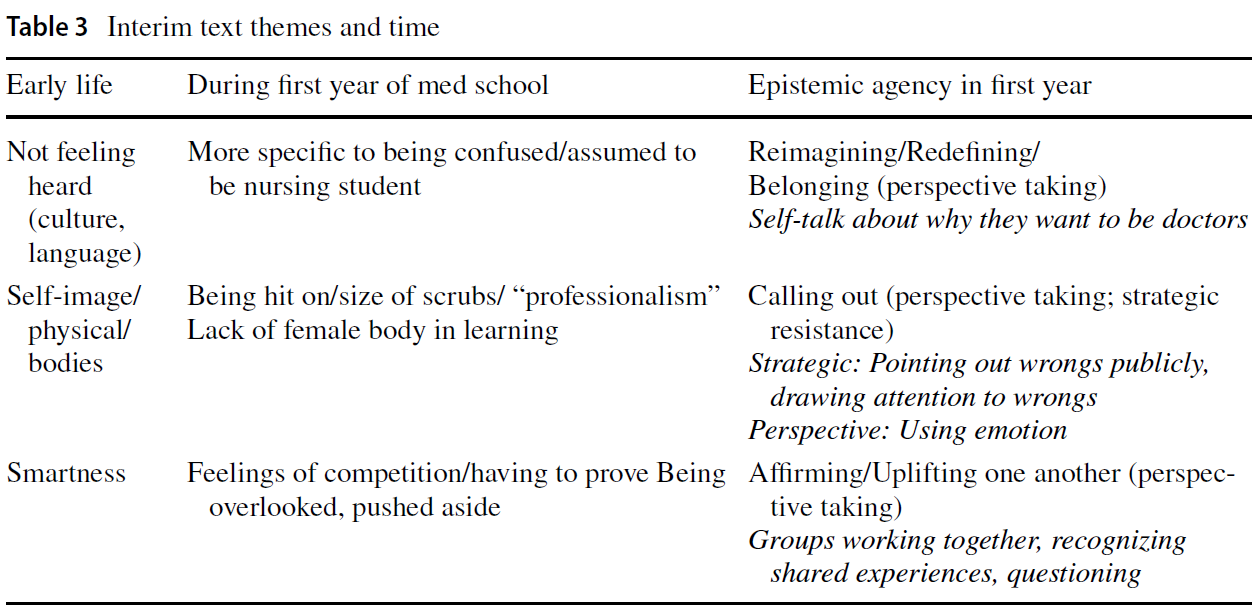 Interim texts were drafts of possibilities for how we organized our findings, and what stories we would emphasize (Clandinin & Connelly, 2000; St. Pierre & Jackson, 2014). They served as texts between first and second phases of coding and code bundling (Saldaña, 2016) and final versions of findings; writings that helped us make negotiations with one another and the story we told. Table 3 Interim Text Themes and Time is an example of one of our final interim texts that organizes early experiences of epistemic injustice in healthcare settings, moments of epistemic injustice in medical school, and examples of epistemic agency in response to injustices. Each column represents what we call “plot-points” in time. Within each row are the themes we identified according to injustices or agency. Moving from left to right on the table places these injustices in time and examples of how participants redressed injustices. Each row loosely connects the cells from left to right. Although our presentation of findings does not include specific examples of “early life,” we included this as a column to illustrate how we pulled on the entirety of a participant’s life to inform our narrative analysis. For example, being assumed to be a nurse or feeling confused are reminiscent of early experiences some participants shared of not being heard as young women in a doctor’s office. Similarly, instances of being hit on, or when participants described ways their scrubs looked were reflections of earlier experiences of their physical bodies. Table 3 was a blueprint for how our findings were finally organized.