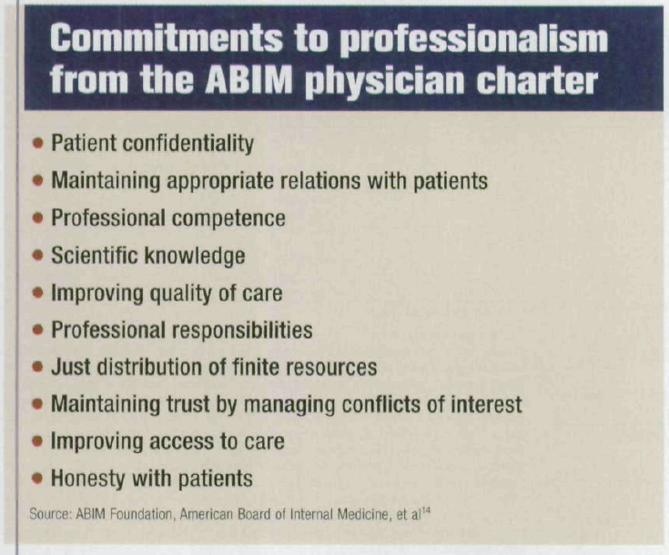 The many challenges to medical professionalism have led to a rebirth of interest in defining and applying professionalism in modem medicine. In 2002, the American Board of Internal Medicine (ABIM) drafted a Physician Charter—a statement of fundamental principles of medical professionalism and a challenge to uphold certain professional responsibilities.