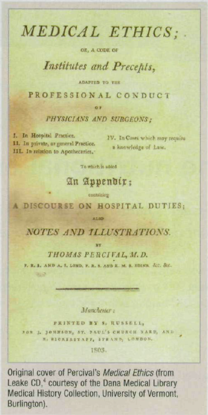 In essence, Percival's code set professional morality above personal integrity in a quiet way that became the new standard. Percival was savvy in that he constructed the document to appeal to both health-care administrators and physicians. He created formal expectations of Original cover of Percival's Medical Ethics (from Leake CD/ courtesy of the Dana Medical Library Medical History Collection, University of Vermont, Burlington). health care while also intimating that physicians could claim the rights of independence and moral authority by virtue of their unique position with regard to understanding and practicing medicine.