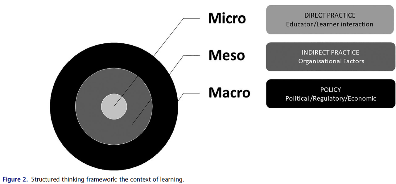 구조화된 사고 프레임워크는 반성적 실천을 발판으로 삼는 데 유용한 접근 방식을 제공할 수 있으며, LS와 AL 모두에서 사용되어 왔습니다. 교육자와 학습자 간의 모든 만남을 통한 학습은 복잡한 상호작용이며, 학습의 결과는 만남의 특정 시점에 다양한 구성 요소의 역동적인 상호작용과 관련이 있습니다(Ricca 2012). 구조화된 사고 프레임워크를 통해 학습을 구성 요소로 분해하면 반성적 실천을 하는 동안 사고와 감각을 심화하여 향후 학습과 교수에 정보를 제공할 수 있습니다. 우리는 학문 및 임상 교육 맥락에서 퍼실리테이터로서 우리 자신의 업무에 맞게 조정하고 개발한 유용하고 사용하기 쉬운 몇 가지 구조적 사고 프레임워크를 제시합니다.