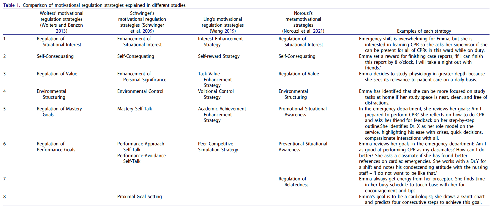 여러 연구를 통해 동기 조절에 대한 이해가 깊어졌지만, 대부분의 연구는 일반 교육 분야에서 수행되었습니다(Wolters 2003, 2011, Wolters and Benzon 2013, Miele and Scholer 2018). HPE의 학자 및 강사를 위해 표 1은 개인과 상황에 맞는 맞춤형 전략을 개발하고 사용하는 데 가장 적합하다고 생각되는 네 가지 프레임워크의 주요 결과를 보여줍니다. 동기 부여 전략에서 맥락적 요인의 중요성에 주목하십시오.