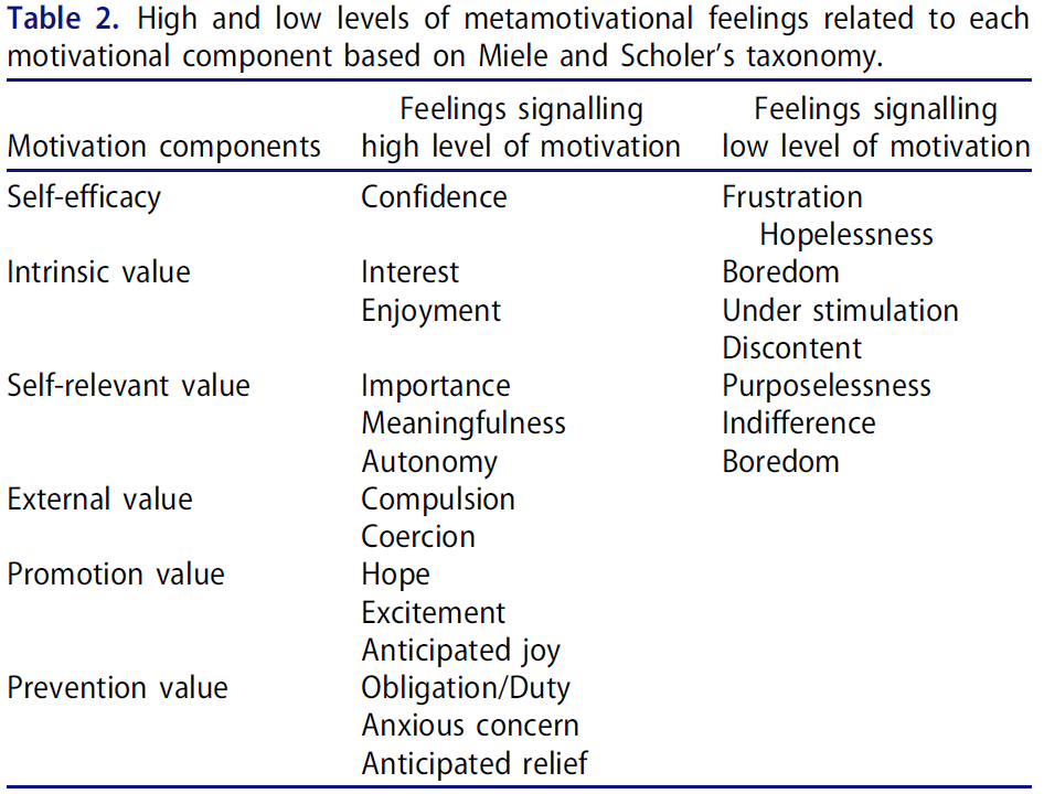 An additional highlight of this work is the linkage between what they termed ‘metamotivational feelings’, where each motivational component relates to a unique set of feelings and phenomenological experiences. These ‘feelings’ characterize high or low levels of motivation and can initiate or terminate control over motivational states. They further introduced six components (self-efficacy, self-relevant value, intrinsic value, external value, promotion value, and prevention value) as motivational components targeted by motivation regulation strategies (Miele and Scholer 2016 2018; Miele et al. 2020). As in Table 2, low-level self-efficacy may lead to frustration and helplessness feelings.