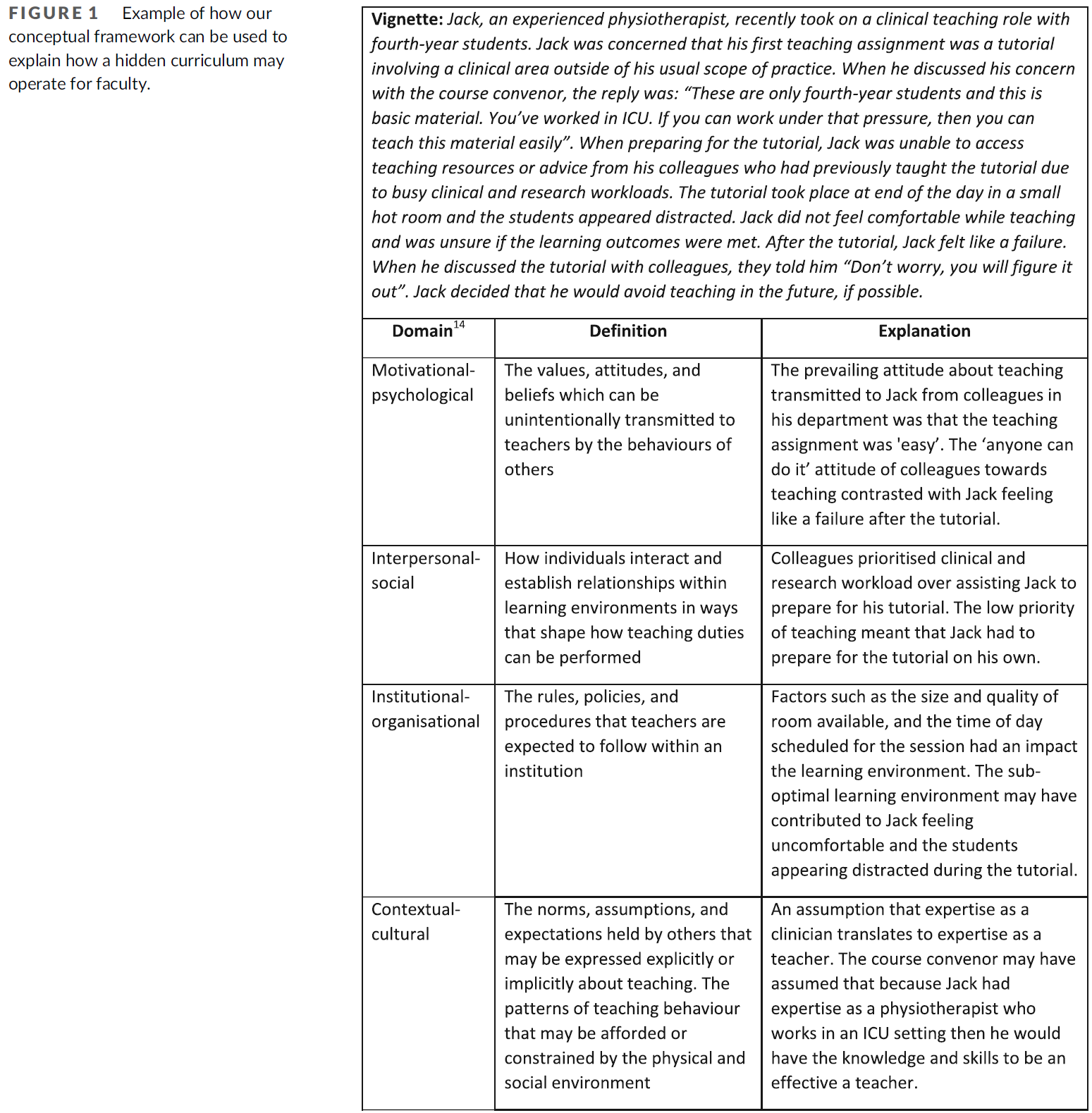 If faculty members perceive, they lack ability to act, then they may question their visibility in the institution.28 Influences that undermine teaching goals can also be identified within the cultural–contextual domain of the hidden curriculum. An example is how health care is prioritised over teaching in workplace learning environments contexts, however, and when unacknowledged, it can undermine the teaching expertise required by faculty. Prioritising health care over teaching can act as a structural barrier for faculty and students. Structural barriers to on-the-job learning can make it more difficult to foster students' capabilities.29 Awareness of influences in the cultural–contextual boundary of the hidden curriculum can assist us to account for how faculty may perceive their role and expertise are valued based on the workplace culture. When faculty feel there is inertia from departments or colleagues to develop or change teaching practice, they may also feel a lack of autonomy to challenge institutional policies and procedures.