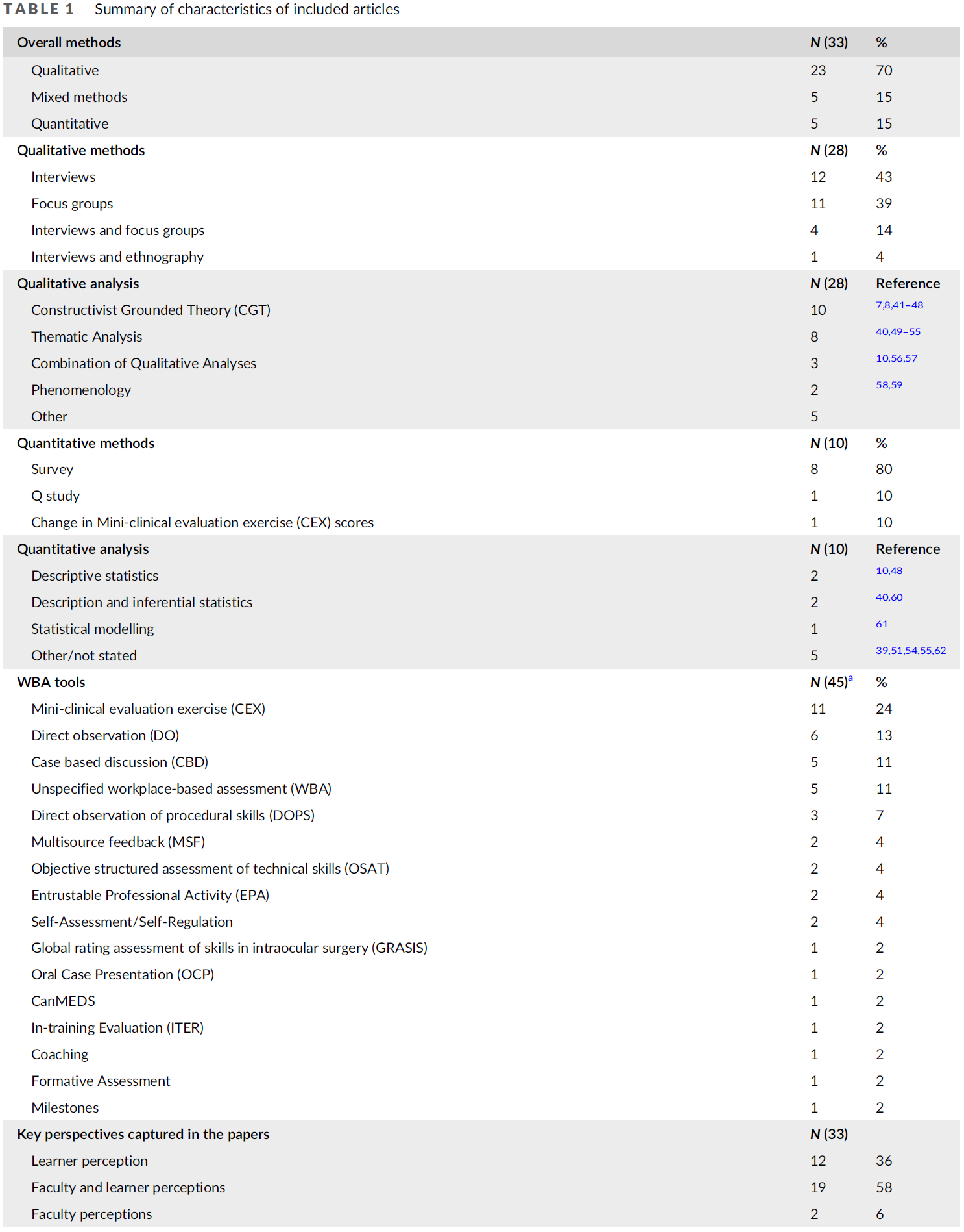 Table 1 summarizes the characteristics of the included articles in this review. A more detailed summary of each included paper is available in Appendix S2. The papers spanned both surgical and medical specialities and were predominantly conducted in North American and European contexts. The majority of the included papers employed qualitative methodology: the specific breakdown included 23 qualitative, five mixed methods and five quantitative studies. Qualitative studies mostly employed interviews (43%) or focus groups (39%). A significant proportion of these qualitative studies employed constructivist grounded theory for the analyses (36%), and most of them focused on the employment of a WBA tool (mini-clinical evaluation exercise [CEX], case-based discussion, etc.). The quantitative studies, or components of mixed-method studies, were survey-based with the exception of two studies, which used a Q methodological study39 and retrospective comparison of assessment scores.40