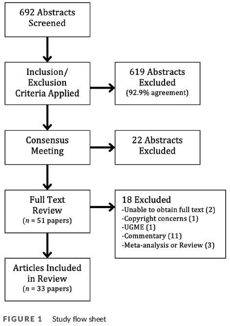 The literature search generated 692 abstracts, of which 51 papers met criteria for the full text review (Figure 1). Of the 51 papers, 33 met the inclusion criteria. The full text reviewed highlighted that there is a relative paucity of primary data informing our understanding regarding the intersection between learning and assessment in the workplace.