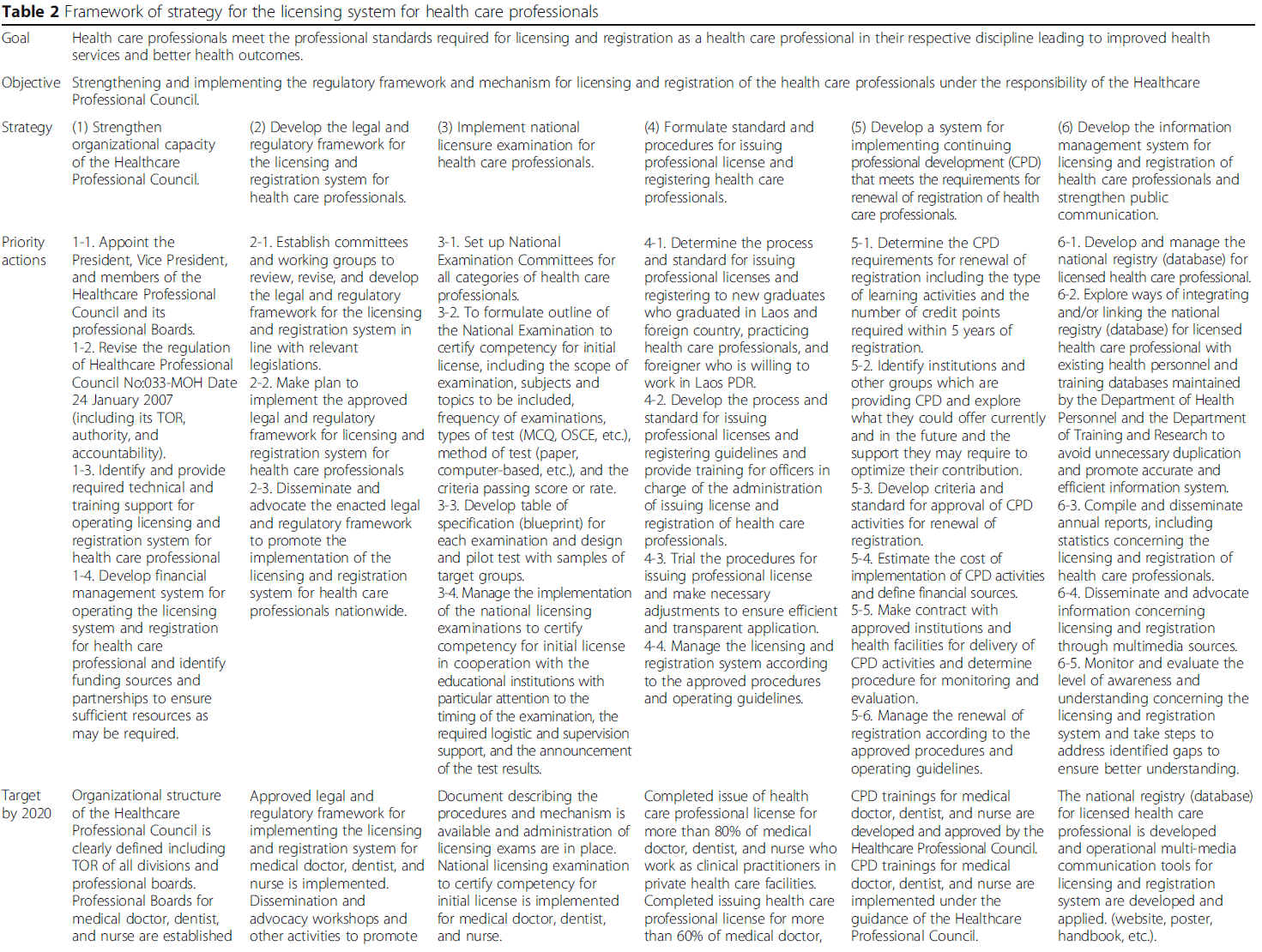In 2015, the MOH endorsed the “Strategy on Healthcare Professional Licensing and Registration System in Lao People’s Democratic Republic 2016-2025” [23]. This strategy ultimately defined the framework for the licensing and registration system and consisted of goals, objectives, targets, and prioritized actions over the next 10 years, with a focus on six pillars (Table 2).