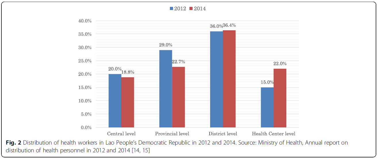 During this period, HRH policy in Lao People’s Democratic Republic shifted from “strengthening the deployment of health workers in rural health care facilities” to “improving the quality of health care professionals.” Although Lao People’s Democratic Republic has taken active steps to strengthen HRH in terms of quality and quantity over the past few decades, the number of health workers working in the public sector remained virtually unchanged between 2006 and 2012. The total number of health workers stagnated at approximately 12 400, despite a 23% increase in population during the same period (Fig. 1) [13]. This was because of the limited absorption capacity of HRH in the public sector. To address critical health care workforce shortages, especially in rural areas, the Ministry of Health (MOH) has actively promoted the recruitment and retention of health workers. In addition, the Lao government recently promulgated a decree on placing new graduates in lower-tier health care facilities, especially in rural and remote areas. As a result, the percentage of health care workers at the health center level has increased, making basic health care services available to the general population (Fig. 2) [14, 15]. According to “The Health Sector Reform Framework Laos” [16], three phases of reform were applied to improve the delivery of health care services and achieve the desired outcomes.