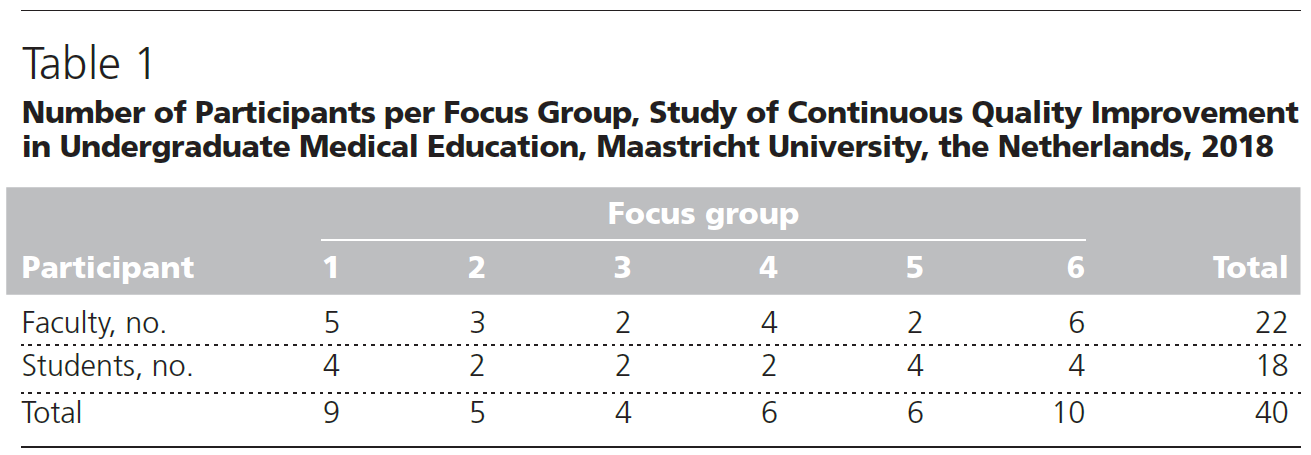We developed an initial focus group guide, with questions structured according to the PDCA cycle. The choice to follow this structure was based on the presupposition that optimizing each step of this cycle will lead to CQI. The guide (Supplemental Digital Appendix 1 at https://links.lww.com/ACADMED/A909) was tested in a pilot focus group session with former EC members from the researchers’ home institution and thereafter adjusted; the order of questions was revised, and the use of theoretical concepts was limited. In May 2018, we approached the ECs of all 8 medical schools in the Netherlands. Six of the 8 committees agreed to participate. Reasons given for not participating were the required time investment and difficulty in planning a meeting and changes in the composition of the ECs. In total, 40 EC members (18 students and 22 faculty) participated in the 6 focus groups (see Table 1). The meetings were conducted between July and December 2018. All meetings (average duration, 79 minutes) were transcribed verbatim, and anonymized and coded transcripts were sent to participants for approval. At the start of each focus group, we asked participants to write down what they considered the most important elements of a quality culture. This exercise activated prior knowledge and was used as a form of data triangulation. At the end of the focus group meeting, we asked participants if their written comments were covered in the discussion.