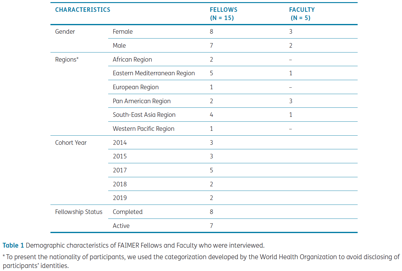 Fifteen FAIMER Fellows and five FAIMER Faculty from 12 countries participated in the study (Table 1). Below, we present our findings according to the two areas of inquiry. Quotations are referenced by Fellows (F) or FAIMER Faculty (FF).