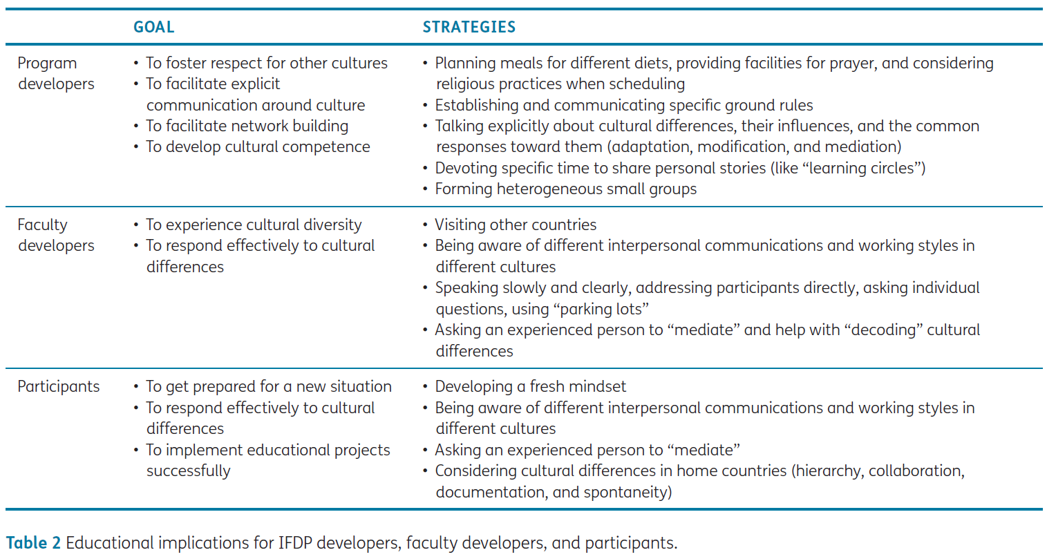 We have summarized the educational implications for faculty developers and participants in IFDPs in Table 2. From a research perspective, we encourage educators to examine IFDPs in different locations; for example, FAIMER Regional Institutes could be a valuable data source for exploring the influence of culture in “home” settings. Additionally, using other methods such as ethnography could provide more insights into the influence of culture on teaching and learning in IFDPs, with a focus on the influence – and interaction – of professional and program cultures as well. Further exploration of faculty development through the lens of TLT would also be worthwhile.