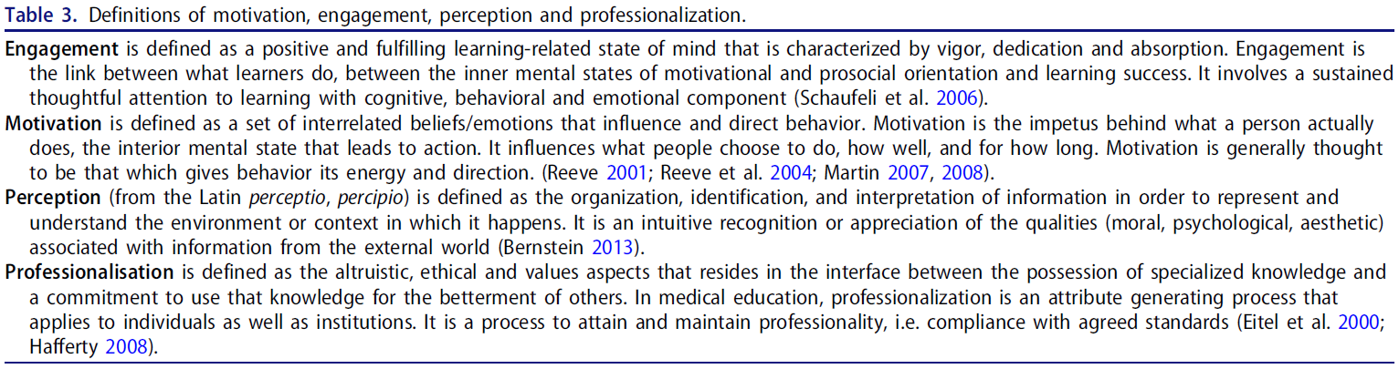 "동기부여"라는 단어의 라틴어 어근은 "움직이다"를 의미하므로, 동기부여에 관한 이론 2는 교육자가 FD 활동에 참여하고 배우기 위해 "움직이도록" 돕는 데 있어 기대, 필요 및 가치가 수행하는 역할에 대한 이해를 제공합니다. 동기부여 이론은 시간이 지남에 따라 진화해 왔으며, 인간 심리의 복잡성 때문에 동기를 내적 또는 외적 현상으로 단순하게 이분법적으로 해석하는 것은 더 이상 사실이 아닙니다(Misch 2002; Brissette & Howes 2010). 우리는 이전에 단기적으로 FD에 대한 가장 중요한 동기는 개인주의적 동기이며, 상위 세 가지 개인적 동기는 개인 개발, 경력 개발 및 개인적 교육 관심이라고 보고한 바 있습니다(Sorinola 외. 2013, 2015). 이 연구는 더 나아가 의학교육자의 요구와 FD의 관련성 및 연계가 장기적인 동기 부여의 핵심 맥락적 요소임을 시사합니다. 이는 특히 FD에 대한 체계적 문헌고찰을 통해 "무엇이 FD 참여에 동기를 부여하는가?"라는 스타이너트 등의 질문에 대한 답변으로 FD 개발자에게 중요한 포인트입니다(스타이너트 등, 2006). 또한 FD 참석 후 교육자들이 확인한 결과로서 역량 향상을 명확히 했습니다. 교육자들은 역량을 FD 참석을 통해 얻은 지식과 경험 및 실습을 통해 개발한 전문성을 결합하여 올바른 태도로 교육에 적용하는 것으로 개념화했습니다.