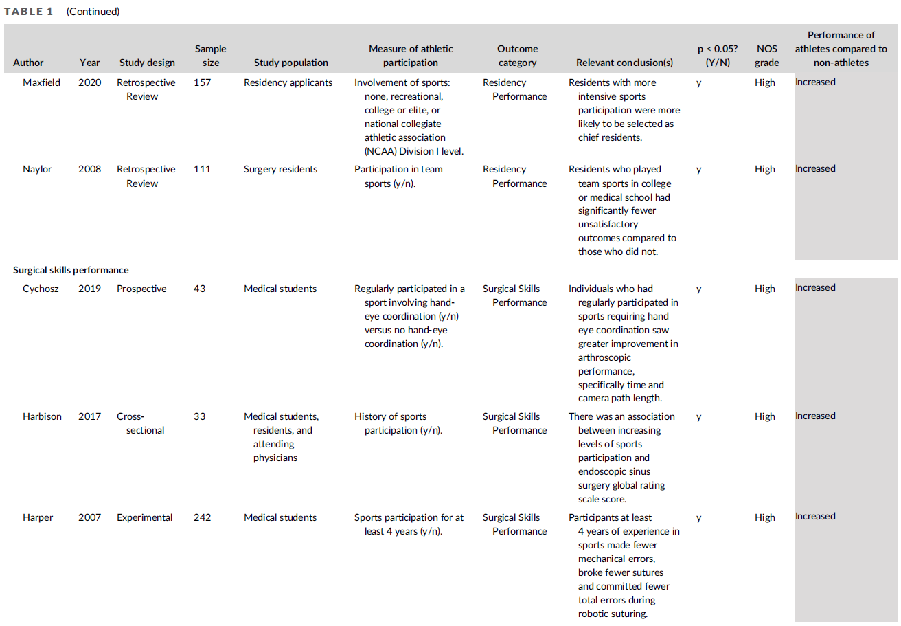 Six (33%) studies evaluated the relationship between prior athletic experience and surgical skills performance.