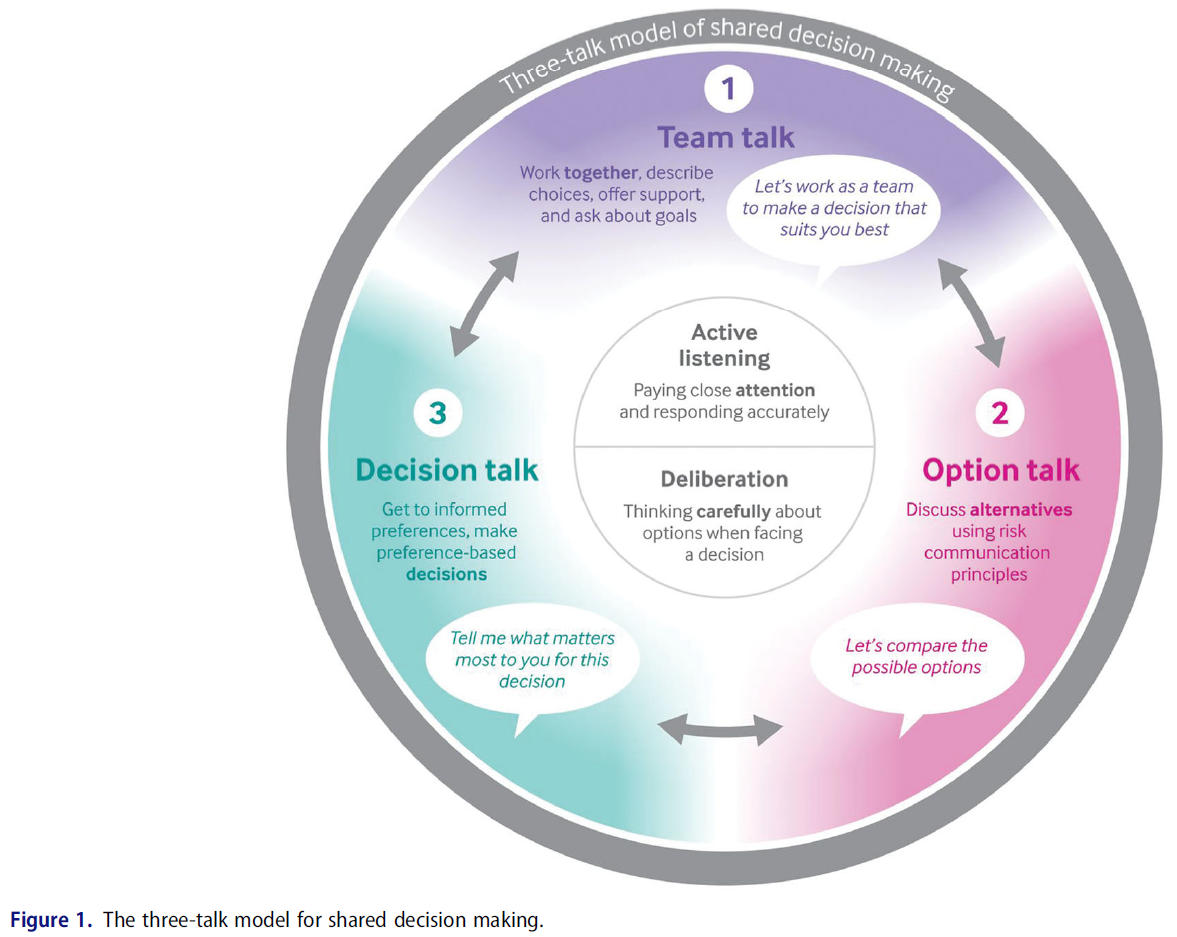 These three stages need not be done in this order. In all three stages, active listening and deliberation play a central role (Elwyn et al. 2017). Thus, relational competencies are important in all three stages, though risk-benefit communication competencies are most central to the ‘Option talk’ stage.