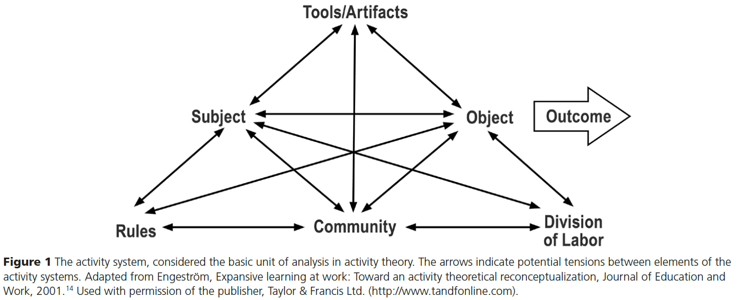 CHAT proposes that humans learn by doing, that they use tools to learn, and that community plays an important role in human activity. Russian psychologists Vygotsky and, then, Leont’ev developed the concept that a human’s actions are mediated by cultural artifacts (tools). 13 Engeström expanded on the contribution of community and other outside factors to all activities by incorporating in the theory rules, community, and division of labor and their influence on a person (subject) and that person’s mediated action (object). 13 This activity system is considered the basic unit of analysis in activity theory (Figure 1).