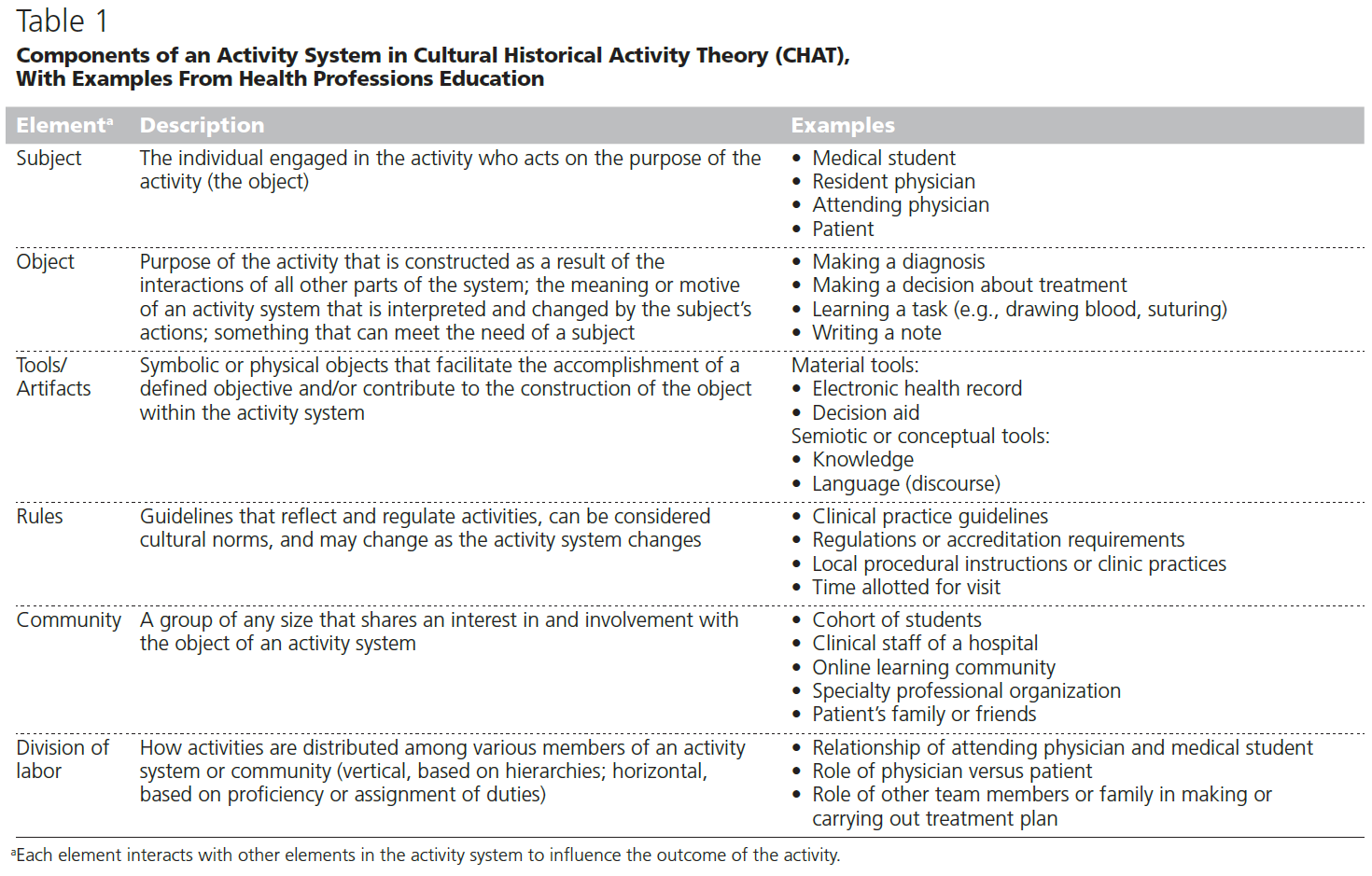 그림 1에서 활동 시스템의 각 구성 요소 사이의 화살표는 활동 시스템 내의 잠재적 긴장을 나타냅니다. 보건 전문직 교육의 예를 들어 CHAT의 활동 시스템 구성 요소에 대한 설명은 표 1을 참조하세요.