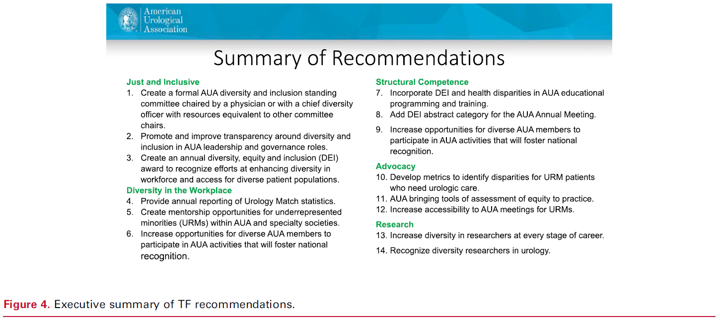 D&I TF는 2022년 2월 AUA 이사회에 상정하기 위해 우선순위를 정하지는 않았지만 향후 고려를 위해 부록 4(https://www.jurology.com)에 포함된 추가 권고안을 개발했습니다.